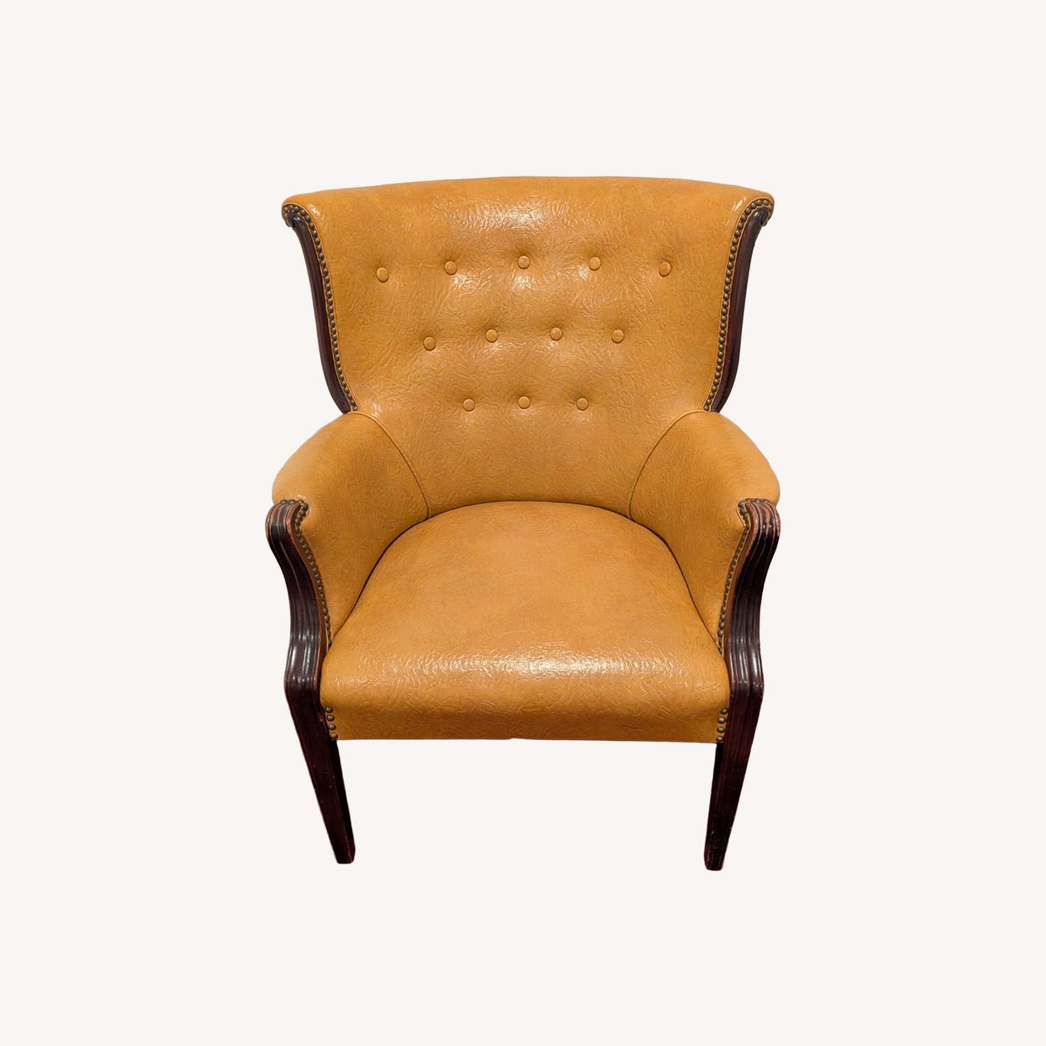 Seller's Notes:Beautiful, unique leather vintage chair. Has details such as nailhead trim. Minor signs of wear are dings and scrapes to the wood leg and armrest - see detailed photos. Has been in the family and loved for over 20 years, no pets or smoking. Has some spring left in the seat - it feels solid. The first picture is the most accurate in color; it is a vibrant mustard. The leather has an embossed pattern to it.