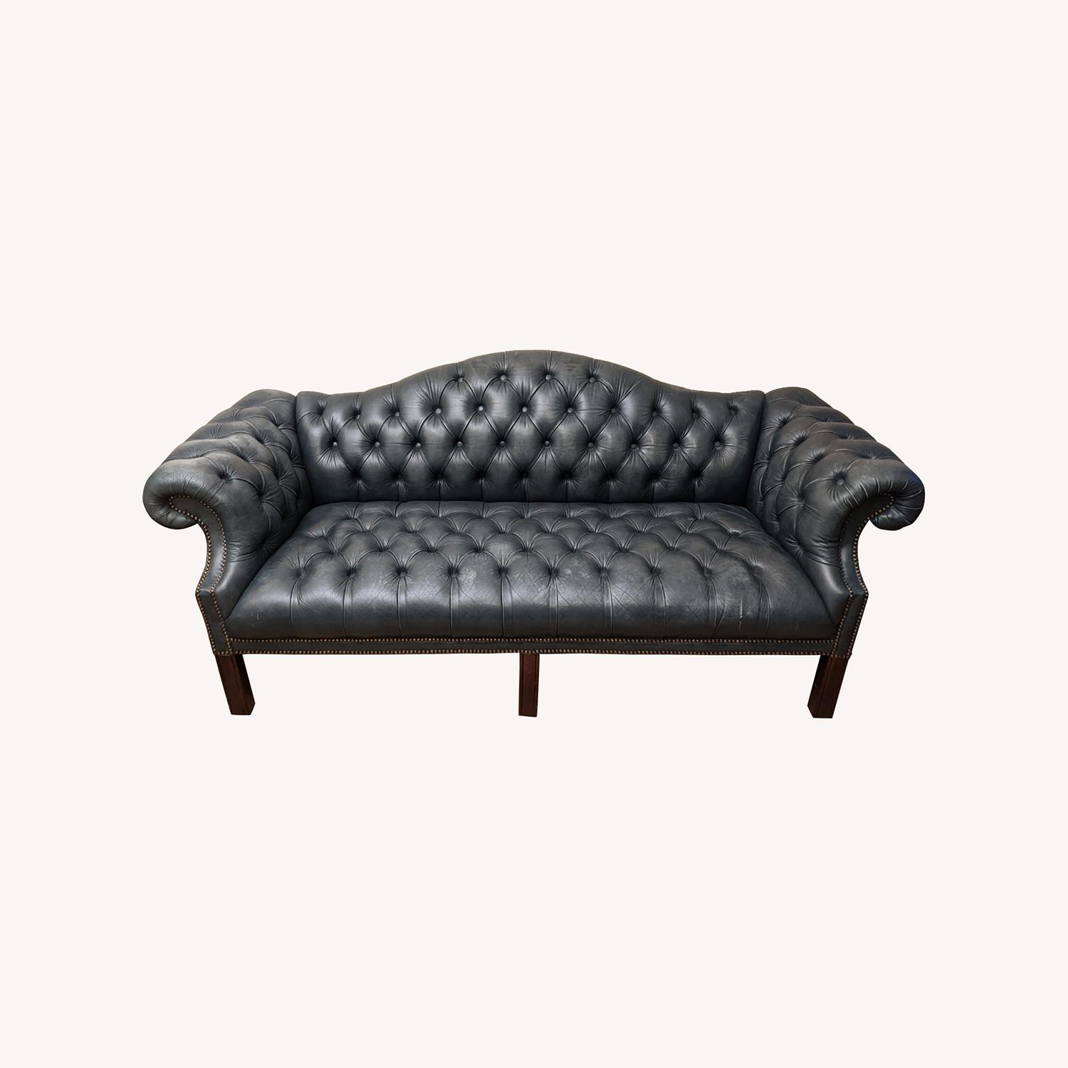 Seller's Notes:Vintage/Antique navy blue leather, button tufted, 3+ seater rolled arm sofa with nailhead trim. Minor color fading due to placing the sofa near a window with the sun shining on it. One minor scratch near front of seat. No holes or punctures.