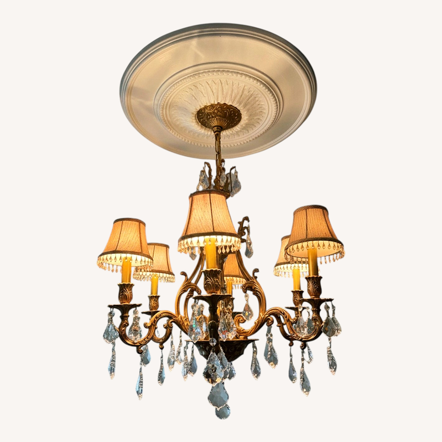 Seller's Notes:American Brass and Crystal 6-light candle chandelier with fabric shades of the Chateau family. Beautiful addition to your dining room. Chain and wire included. Uses six 40 watt candelabra bulbs. (Item # CH9631-A-03G) Like new.