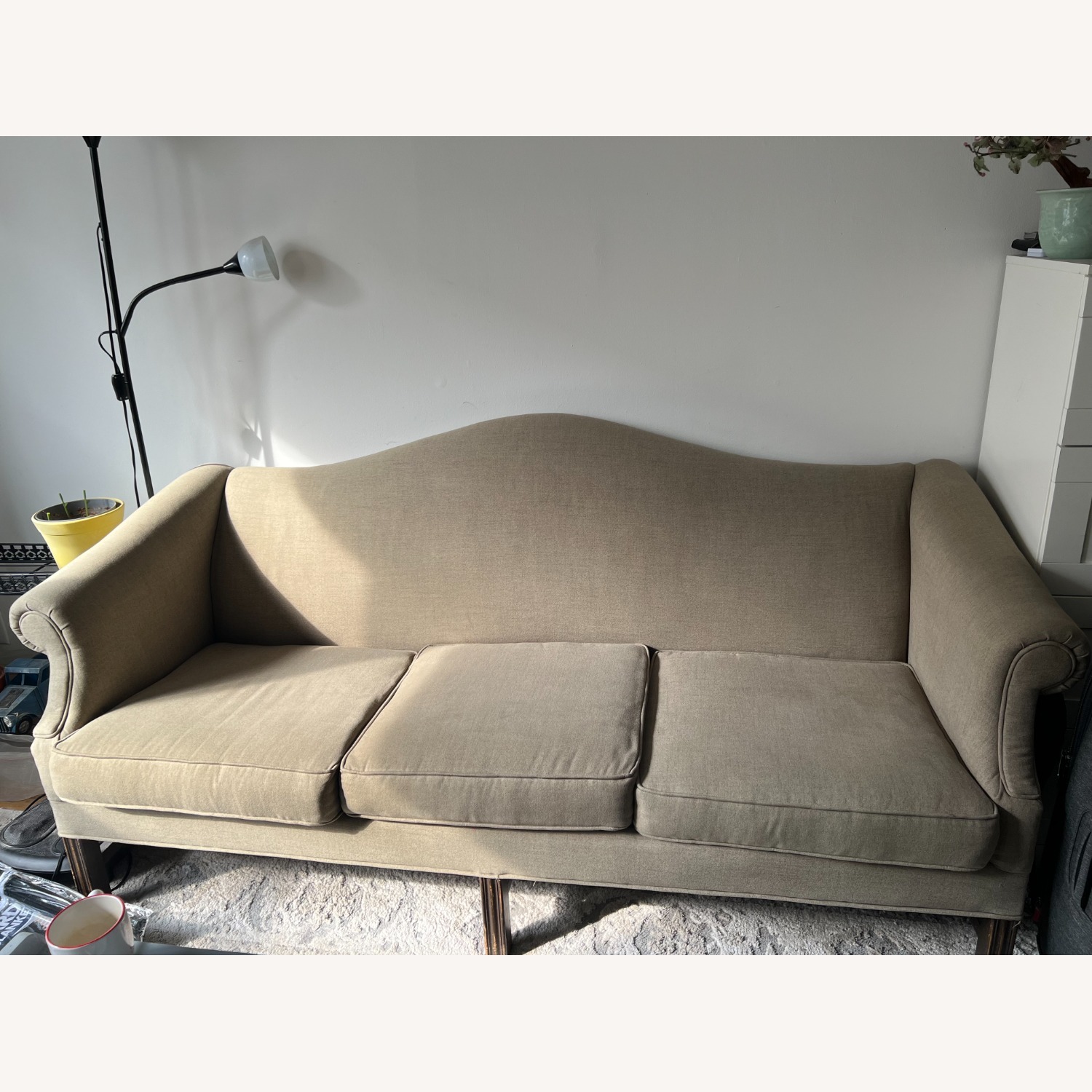 Seller's Notes:Tan upholstered sofa in good used condition with removable, machine-washable upholstery covers. Neutral color that works well in most spaces. There are a couple of minor scratches on the legs from normal use. This was kept in a nice condition in a smoke free/ pet free home. Overall, the sofa is sturdy, very comfortable, and has been well maintained in excellent condition. Dimensions (inches): • Depth: 35” • Width: 80” • Height: 38” I accept cash/Venmo/Zelle/whatever AptDeco uses as well.