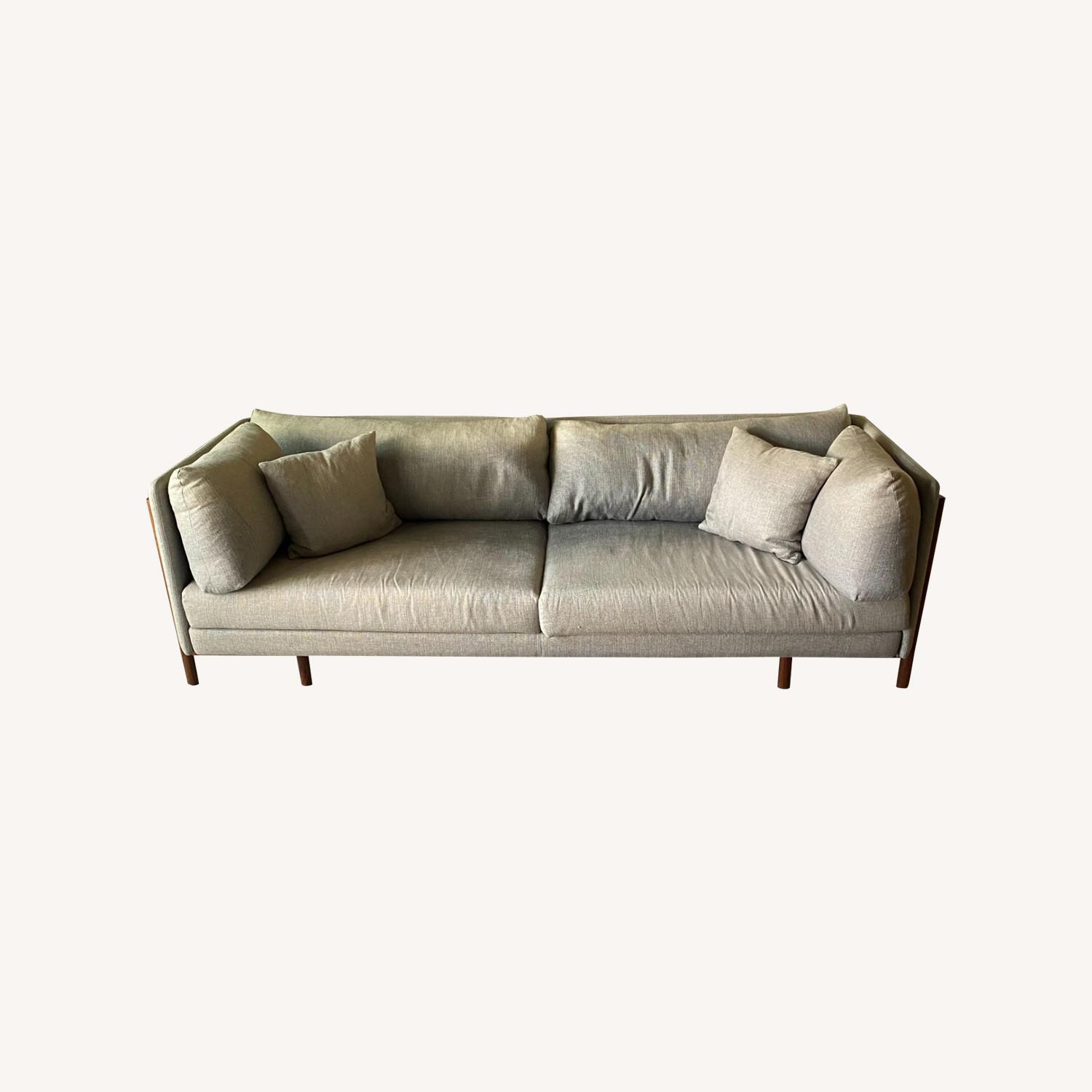 Seller's Notes:This sofa was selected by our designer for a house in CA, then in high quality storage for several years. It's lovely to lie on and read. The wood accents make it unique. All the pillows have down and the bottom cushions remain firm.