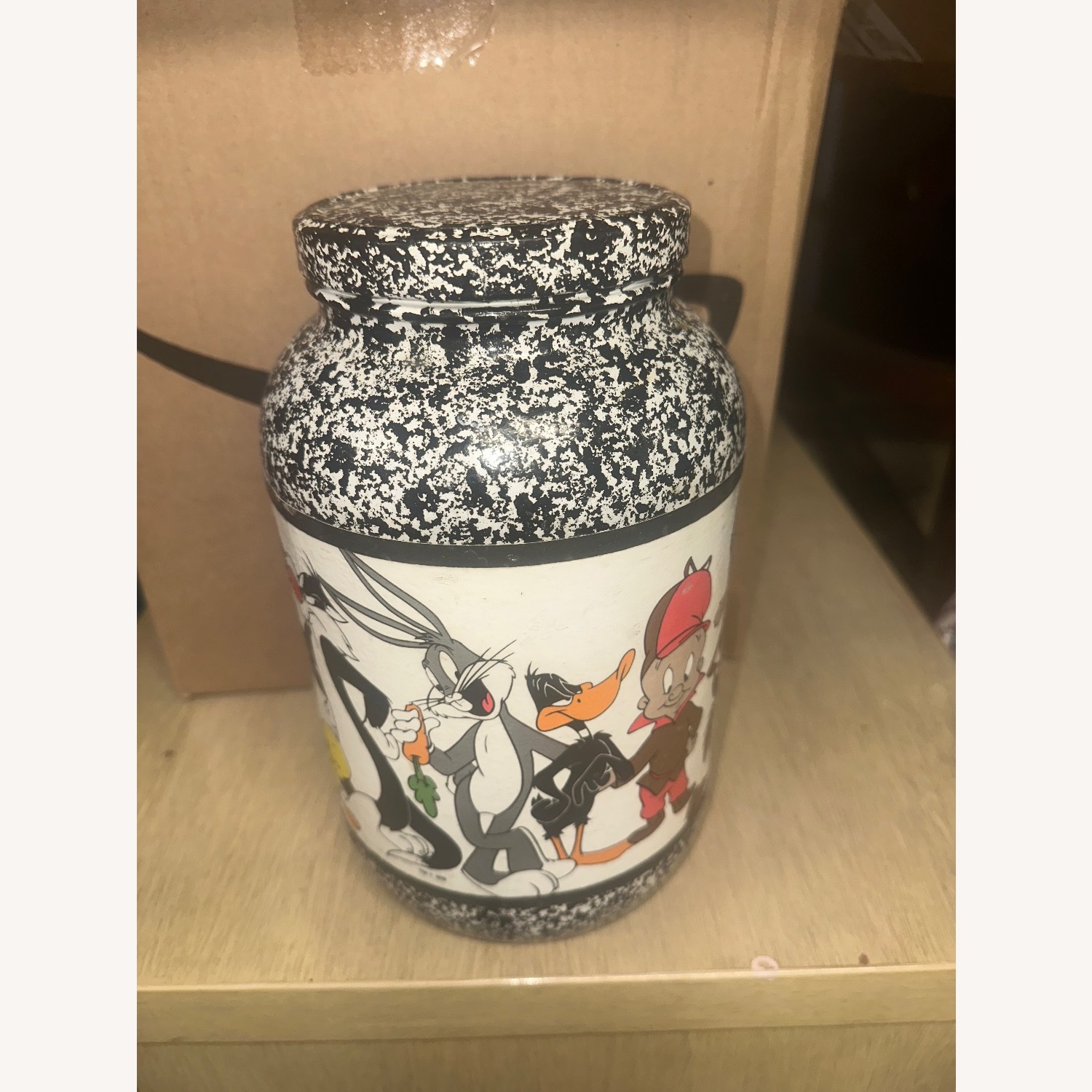 Seller's Notes:Vintage Looney Tunes Glass Cookie Jar – 1970s–80s Vintage heavy glass storage jar featuring classic Looney Tunes characters including Bugs Bunny, Daffy Duck, and Porky Pig. Finished in a distinctive black-and-white speckled glass with colorful character artwork, this piece is a standout example of retro pop-culture décor. Originally produced as a cookie or kitchen storage jar, it now works beautifully as a decorative display piece for vintage kitchens, shelves, or collector spaces. Condition: Very good vintage condition with light, age-appropriate wear. Glass is intact with no visible cracks or chips. Lid included.