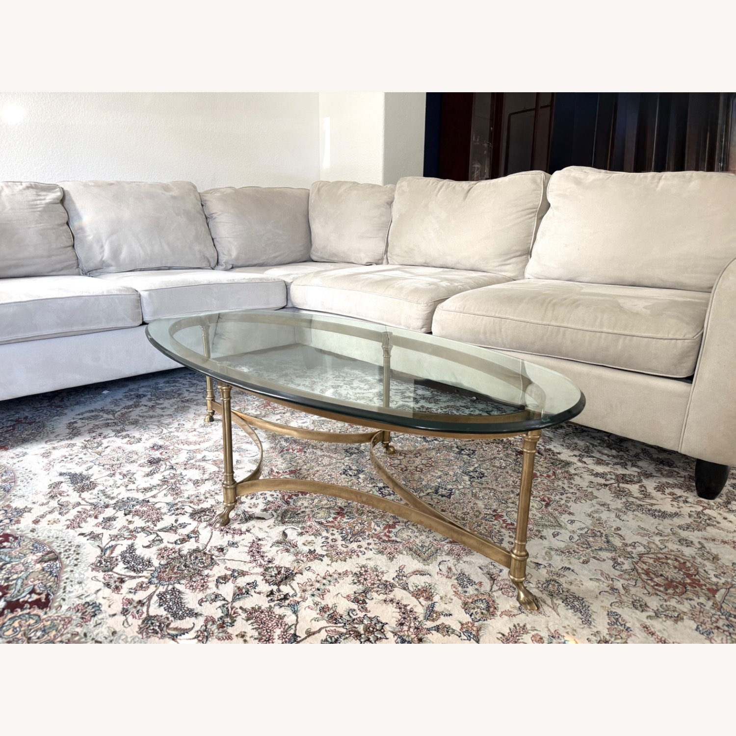 Seller's Notes:Gorgeous LaBarge Hollywood Regency Brass and Glass Hooved Feet Oval Cocktail Table This statement piece features graceful curved stretchers, original beveled glass top, and iconic hooved feet. Original vintage condition consistent with use and age. Very minor surface wear with natural patina. This piece presents very well and retains complete structural integrity.