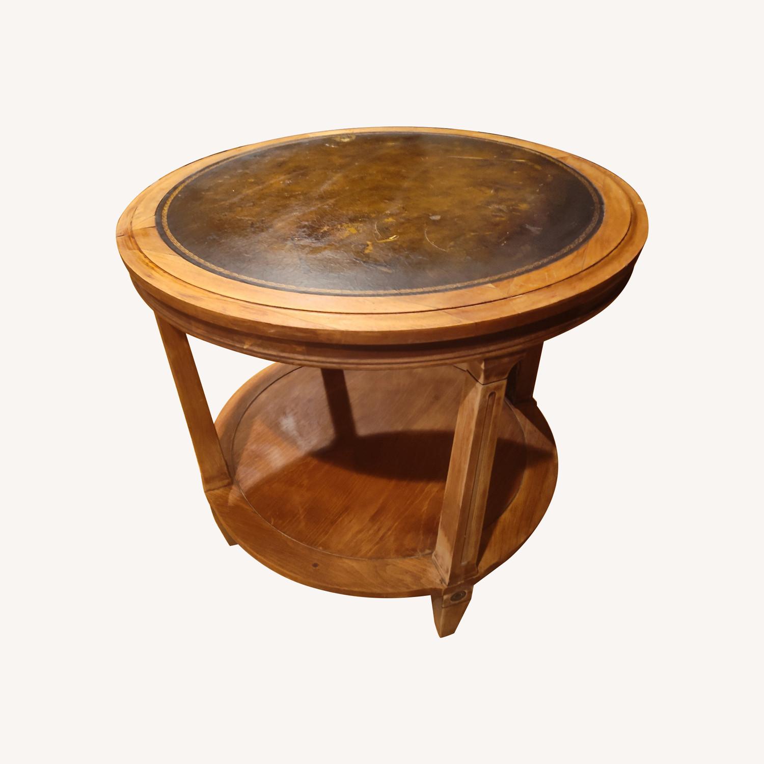 Seller's Notes:Vintage “Heirloom” Weiman Round Lamp Table With Gilt-Stamped Leather Top Early 20th century round lamp table by Weiman Furniture from Virginia, crafted in Heirloom style and finished with Gilt stamping around the edges of the leather-topped surface. Wood has been well maintained over decades, though the leather shows faint distress from sunlight. The table occupied space in a front parlor, so daily activity and wear and tear was not an active factor in its aging. The columns separating the lower deck from the top are a simple turned design with clean lines. The only embellishments are concentric graduated buttons at the top of the feet, just below the lower deck. The tabletop is 25” in diameter and the height is 24”. Usable surface of the lower deck is a 20” circle (the residual diameter size is interrupted by the legs).