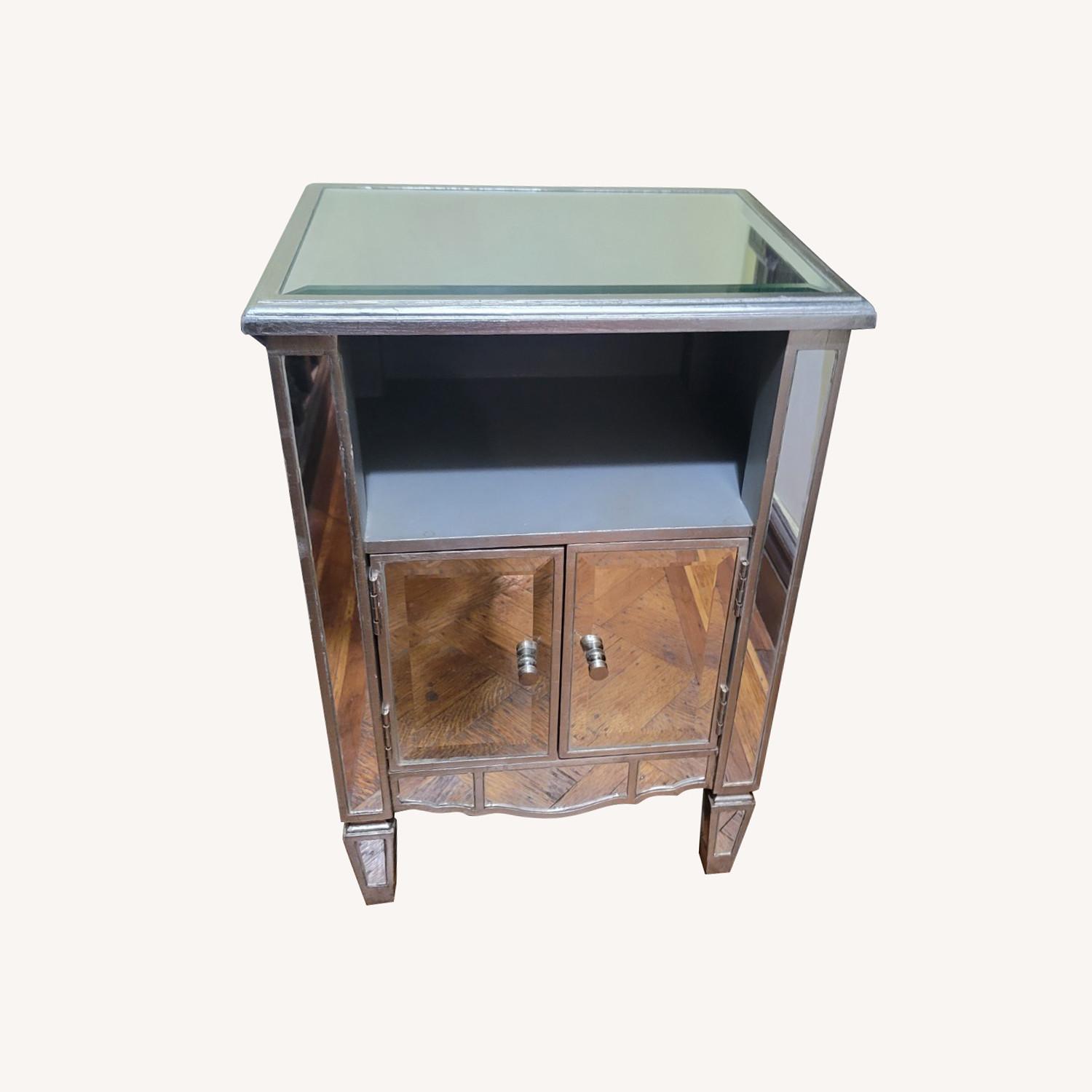 Seller's Notes:Beautiful mirrored night stand, with mirrored finish on three sides. Back side is plain wood. Storage shelf with behind door storage.