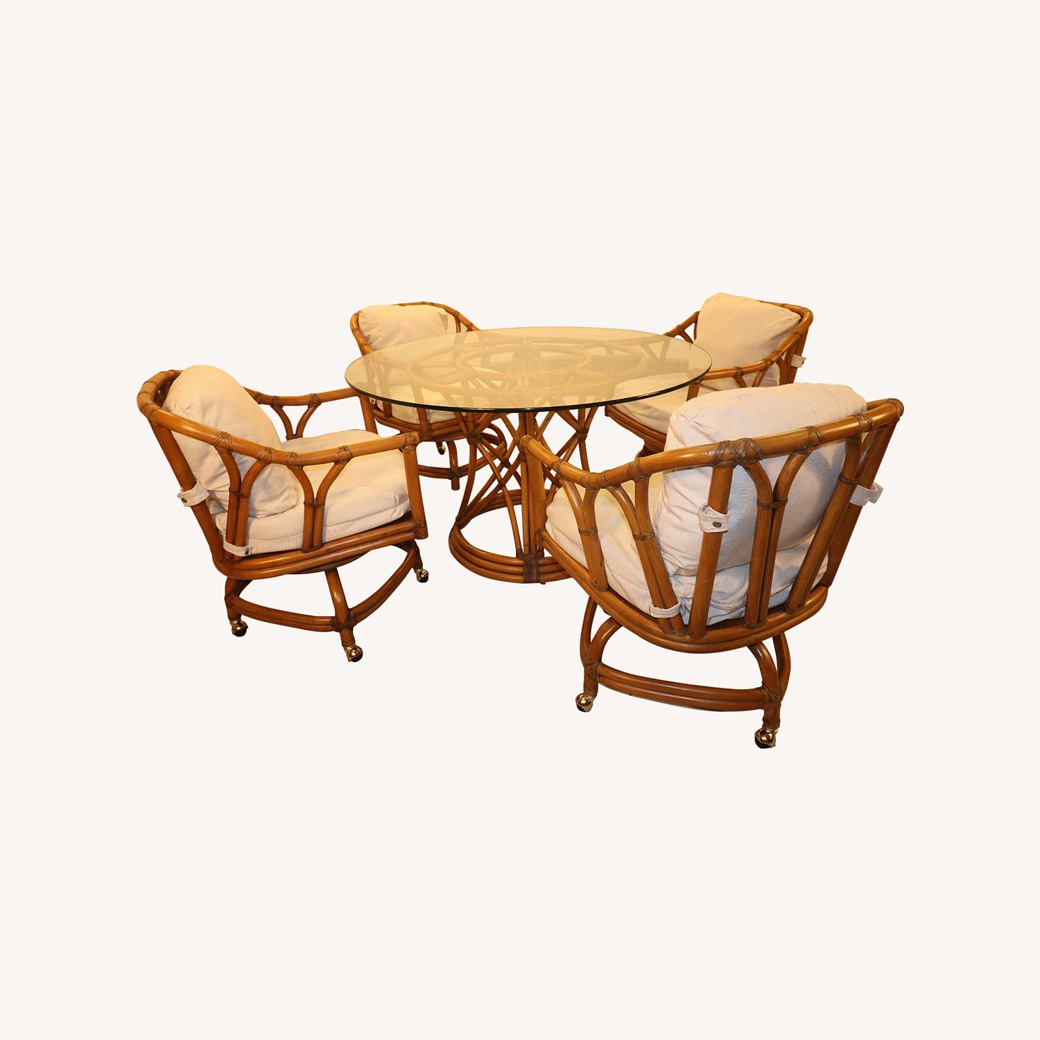 Seller's Notes:Vintage Ficks Reed Mid-Century Rattan Swivel Rocker Dining Set with Brass Rolling Castors, Rattan Table Base and glass top. Elevate your dining space with this authentic Ficks Reed rattan dining set, a perfect mix of mid-century elegance and tropical charm. Crafted with the quality and attention to detail that Ficks Reed is known for, this set is designed to impress and endure. Set Includes: Four Swivel Rocker Dining Chairs: Each chair is beautifully crafted from natural rattan and has original cushions for ultimate comfort. The smooth swivel function adds ease, while the brass rolling castors allow for effortless movement across any space. Rattan Dining Table Base with Glass Top: The matching rattan table base is sturdy and stylish, with intricate rattan detailing underneath. Perfect for family meals, entertaining, or as a unique statement piece. Key Features: Timeless Mid-Century Design: This set’s design captures the relaxed sophistication of mid-century style, bringing both comfort and a classic aesthetic to your home. Convenience & Mobility: Brass rolling castors on each chair provide flexibility without sacrificing style—ideal for versatile, easy living. Superior Craftsmanship by Ficks Reed: Known for high-quality rattan furniture, Ficks Reed combines durability with unmatched style. Add this iconic Ficks Reed dining set to your home and enjoy a piece that blends functionality with the allure of mid-century design. Notes: The chairs are in exceptional structural condition, and all the binding is tight without damage. Because of the age the oils in the rattan have caused the binding to darken. The chairs were cleaned with murphy’s wood cleaner and then finished with boiled linseed oil. On one chair there is a repaired section, 1 inch x 1 inch on the base. It appears to be professionally done and color matched. There are four scuffs on the arms on three chairs. The picture is of the largest scuff. The scuffing is only the very top, thin layer of color and not wood damage. Cushions are original and have been cleaned thoroughly with only very slight, pin-point marks. One cushion is slightly torn at the back zipper corner. Scuffs and damaged area can be seen on our website. Chairs Dimensions: Weight: 25 lbs Heigh: 32 inches Width: 26 inches Depth: 24 inches Seat Depth: 23 inches Ground to seat lip: 16 Inches Table Base Dimensions Weight: 16 lbs Diameter: 32 inches Height: 28 inches Glass Table Top Dimensions: Weight: Approximately 15 lbs Diameter: 36.5 Thickness: 1/4 inch