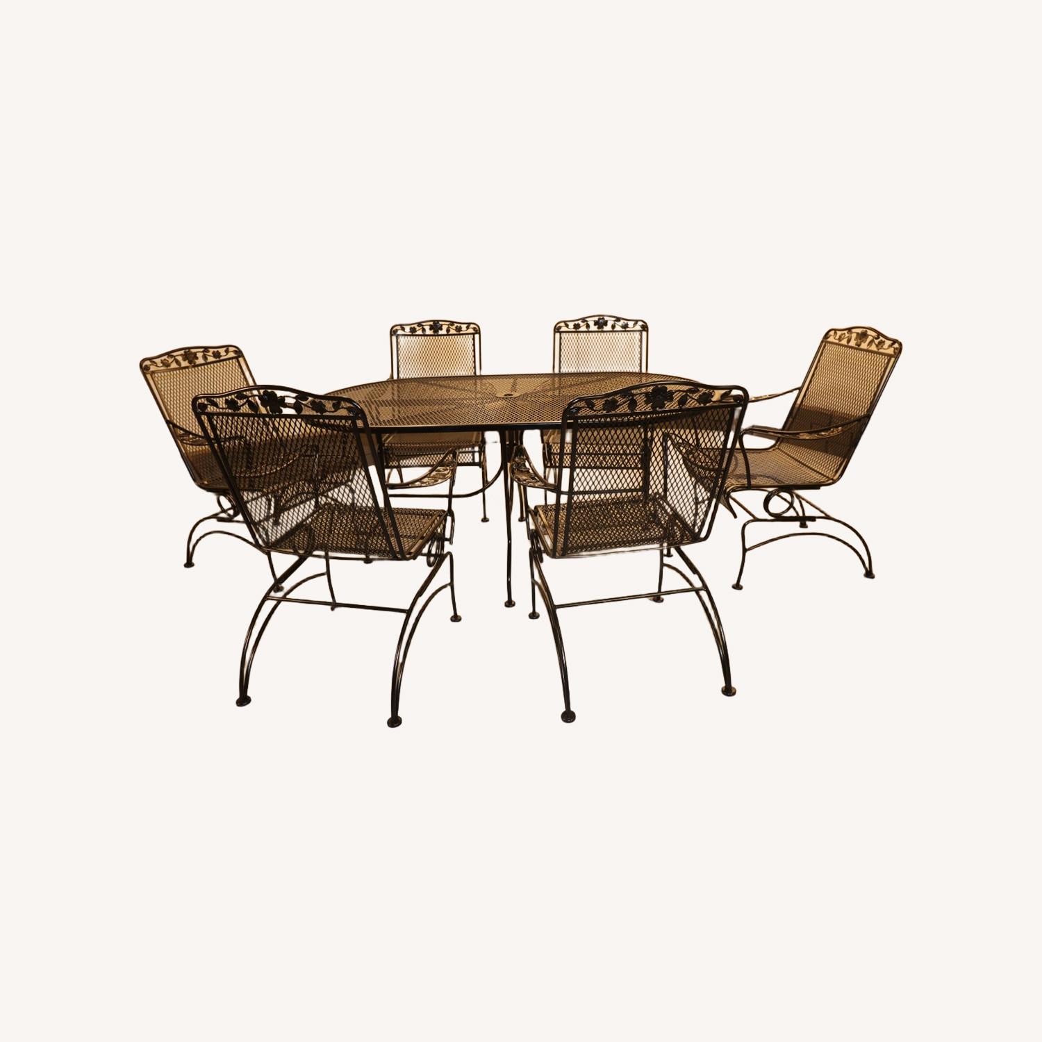 Seller's Notes:Vintage Charm for Your Modern Home! Discover the elegance of the Vintage Russell Woodard Primrose Wrought Iron Family Patio Set. Craftsmanship: Handcrafted with the detailed Primrose pattern, this set combines functionality with artistic flair, showcasing the iconic ornate scrollwork that Russell Woodard is celebrated for. Durability: Made from heavy-duty wrought iron, this set is built to last through the seasons, providing both comfort and style for your outdoor living space. Its timeless design means it can withstand the elements while maintaining its charm. Each piece has been professionally coated using the electrostatic painting process, which ensures a long-lasting, durable finish that resists weathering and rust, making this set perfect for year-round outdoor use. Comfort: Enjoy the comfort of the classic Primrose chairs, designed to complement any outdoor decor with their elegant yet sturdy construction. The set typically includes a table and chairs, perfect for family gatherings or a quiet afternoon tea. Aesthetic Appeal: The intricate floral and leaf motifs of the Primrose set add a touch of vintage sophistication to your garden or patio. Collectible Value: Not only does this set serve as functional furniture, but it’s also a collector’s item. Vintage Woodard pieces are highly sought after, adding a unique value to your home both aesthetically and potentially financially. Dimensions: Weight: 27 lbs Chair Height: 38 inches Depth from front to back: 25 inches Width from outside arm to outside arm: 26 inches Seat Depth: 16 inches Seat height from the ground: 18 inches Table: Length: 66 inches Width: 38 inches Height: 29 inches
