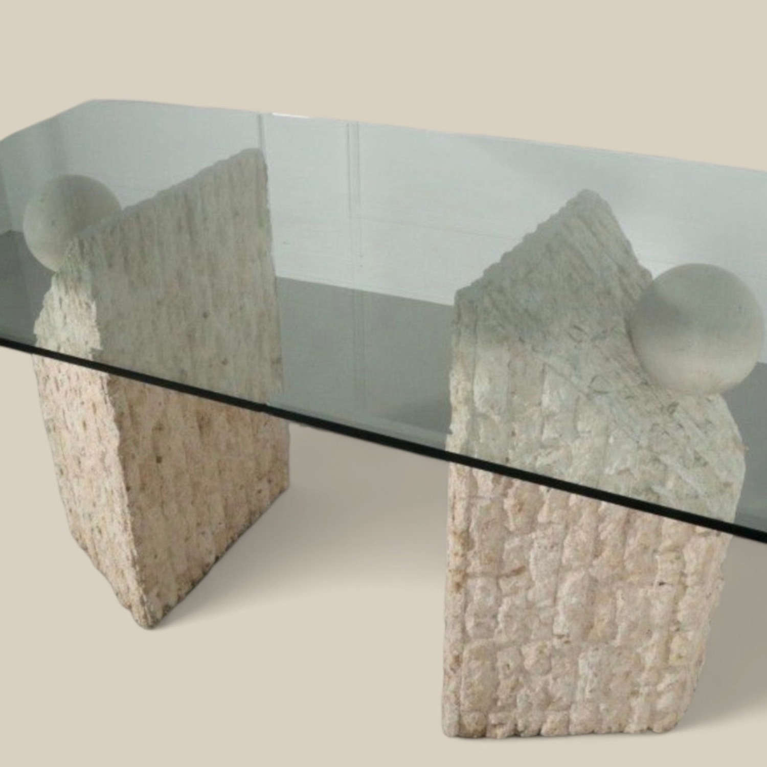 Seller's Notes:Vintage from the 1980s Add a touch of vintage elegance to your home with this Postmodern Mactan Stone and Glass Dining Table from the 1980s-1990s. This unique piece features a stunning rectangular glass top supported by tessellated Mactan stone bases, embodying the bold design aesthetic of the postmodern era. Perfect for dining rooms, this table combines natural materials with contemporary design for a truly distinctive look. Measurements: 72" L x 42" W x 30" H