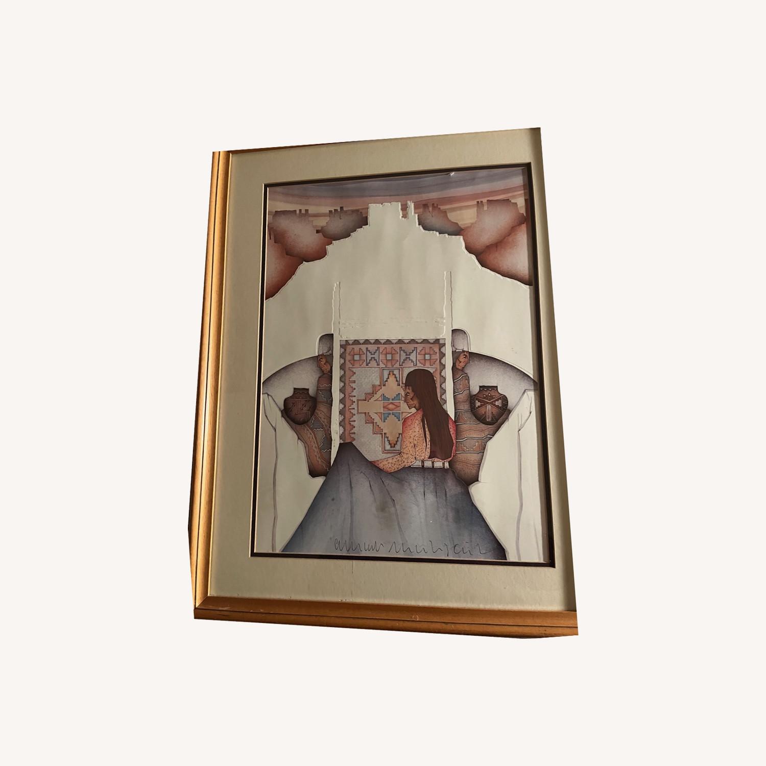 Seller's Notes:Andrew Tsihnahjinnie famed Navajo artist born 1918 passed 2000; raised texture around the mountains in outline. light colored tan frame with an all white mat