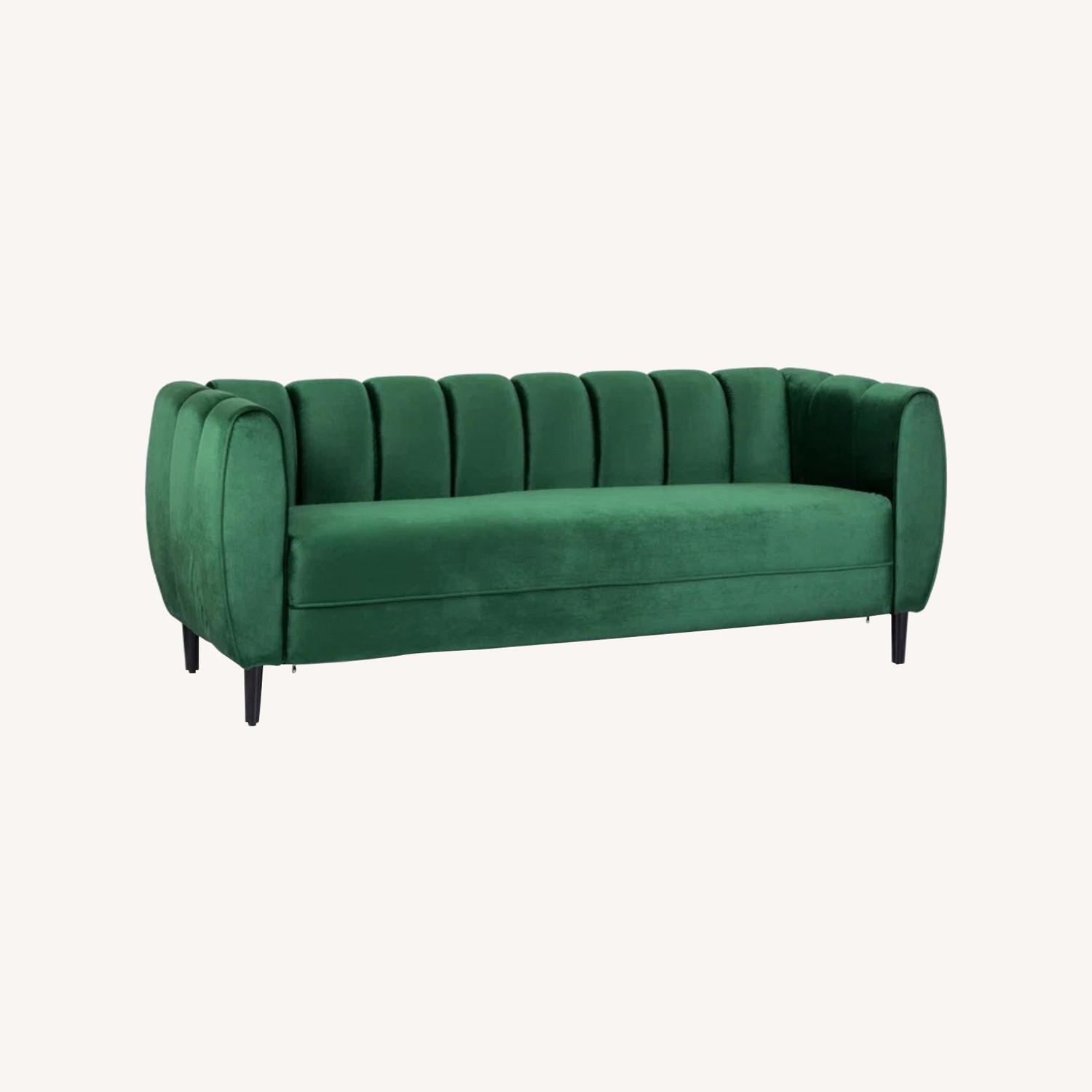 This upholstered sofa brings a glam look to your living room with its velvet upholstery and deep channel stitching. Designed to seat three comfortably, it features a single cushion seat and tufted back that invites you to unwind after a long day. The sofa rests on sleek, dark brown birch legs, adding a refined elegance to your space. Crafted with a blend of solid and engineered wood, it offers a balanced feel of support and softness.