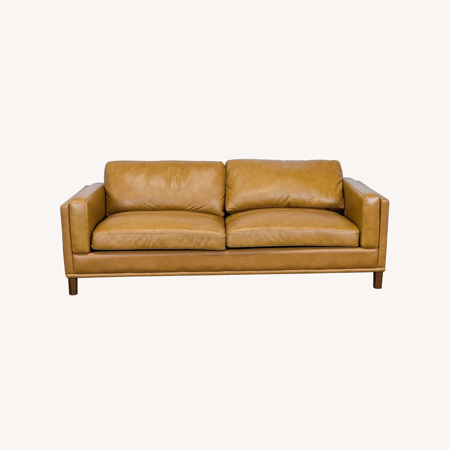 Seller's Notes:Features leather upholstery with detailed stitching, wood legs and track legs.