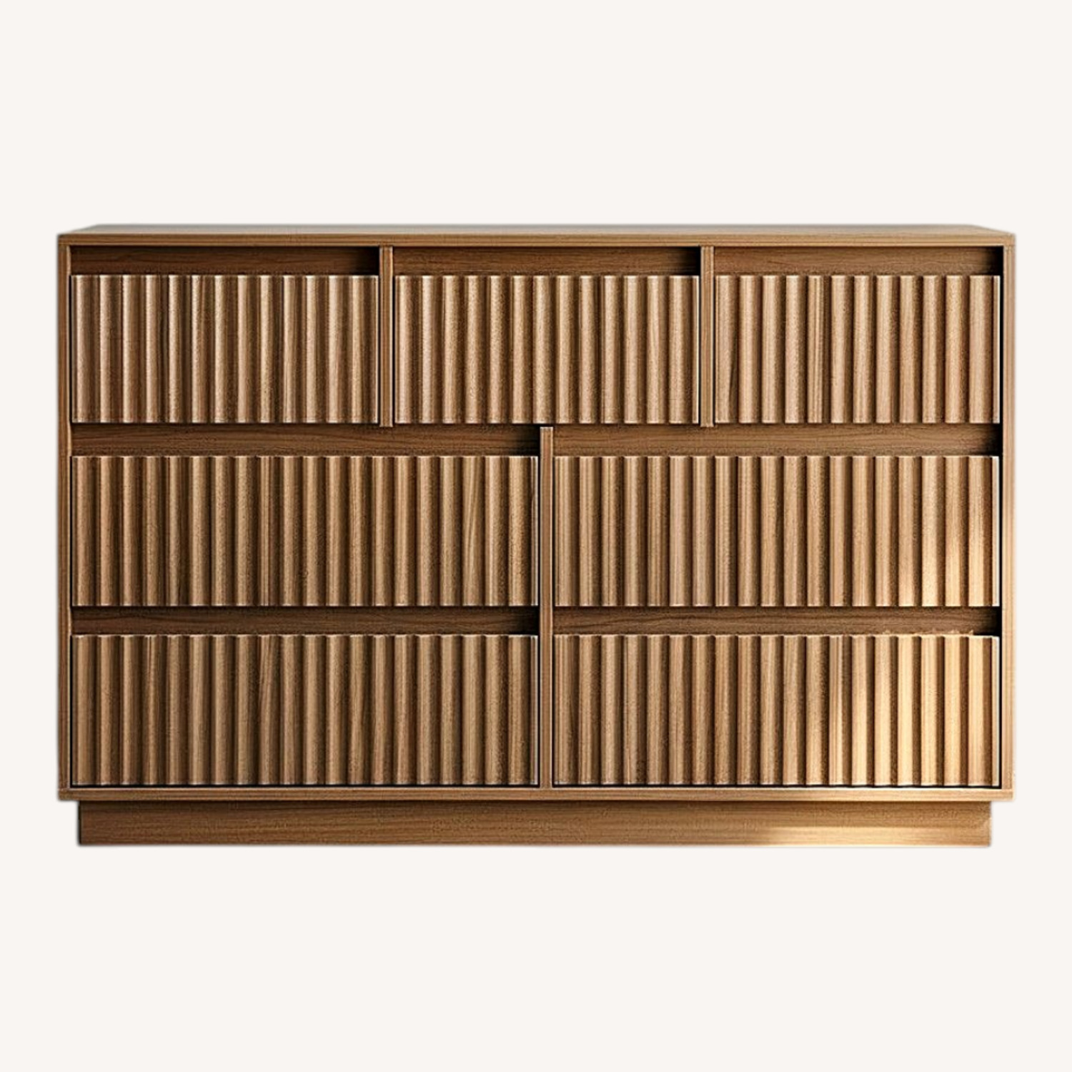 This double dresser features a horizontal silhouette with a clean-lined frame that fits easily into your main bedroom or guest space. It's crafted from engineered wood and features natural woodgrain for added depth across the surface. Seven drawers provide plenty of room to organize your wardrobe, from bulky sweaters to smaller accessories. The drawer fronts showcase waveform fluted detailing, creating a textured look that stands out without feeling overwhelming. Metal roller glides allow each drawer to open smoothly for daily use. Plus, the wooden handles blend into the design for a streamlined finish. Features Seven spacious drawers provide ample storage for your clothing Smooth metal roller glides make opening each drawer easy Waveform fluted panels add a textured look to the front Engineered wood construction offers a balanced and modern profile Included tipover restraint device helps secure the dresser to walls Includes assembly manual and all necessary hardware and fasteners. Components are pre-drilled and pre-cut ready for easy assembly. Please expect color variance between the actual product and photo due to different lighting conditions and online viewing device settings. Dresser: 47.2" W x 15.5" D x 32.5" H ; Drawer: 21.7" W x 11.8" D x 5.1" H ; tabletop capacity: 100 lb ; drawer capacity: 50 lb