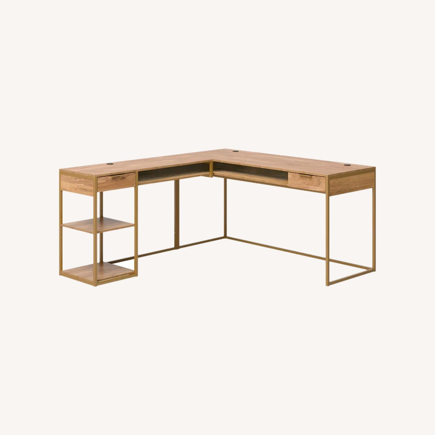 This chic L-shaped glass combines a gold frame with wooden shelves for a mixed-material look in your home office. It's made from a blend of metal and engineered wood, and it's built on top of an open base with a glam gold finish. On the side, two open shelves are perfect for tucking away a small printer or a stack of books. This desk also has two drawers and two open shelves that give you just enough space for office supplies and notebooks. Plus, this desk comes with cable management to keep your wires organized.