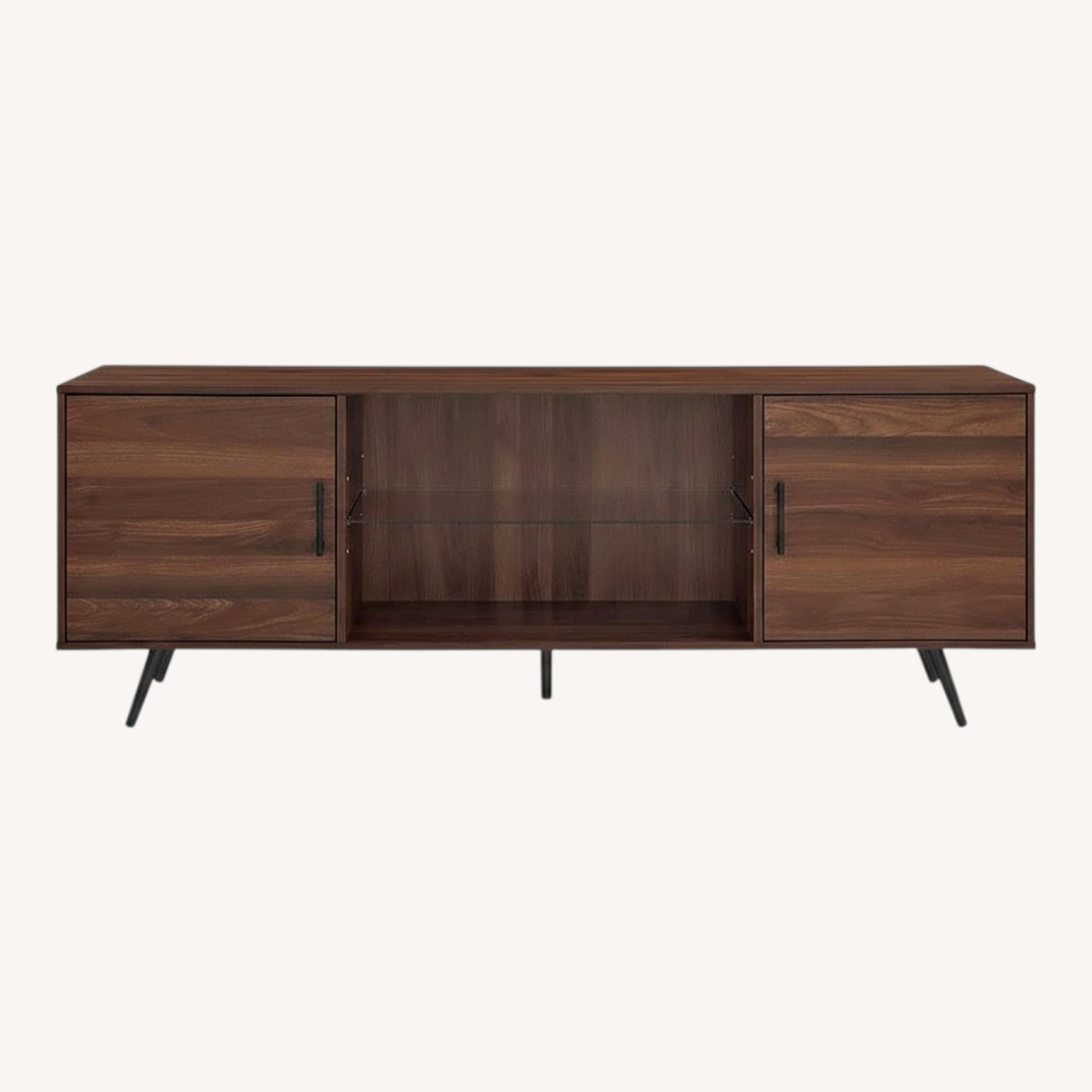 This modern media console combines functionality and style, featuring 2 adjustable shelves and a center glass shelf for versatile storage solutions. The two doors come with adjustable soft-close hinges, offering a seamless look, while the angled metal legs with adjustable rubber feet safeguard your flooring. With cord management ports to keep cables neat, this console is designed to accommodate TVs up to 80 inches. Made from warp-resistant MDF wood, durable laminate, tempered glass, and painted metal, it’s built to last.