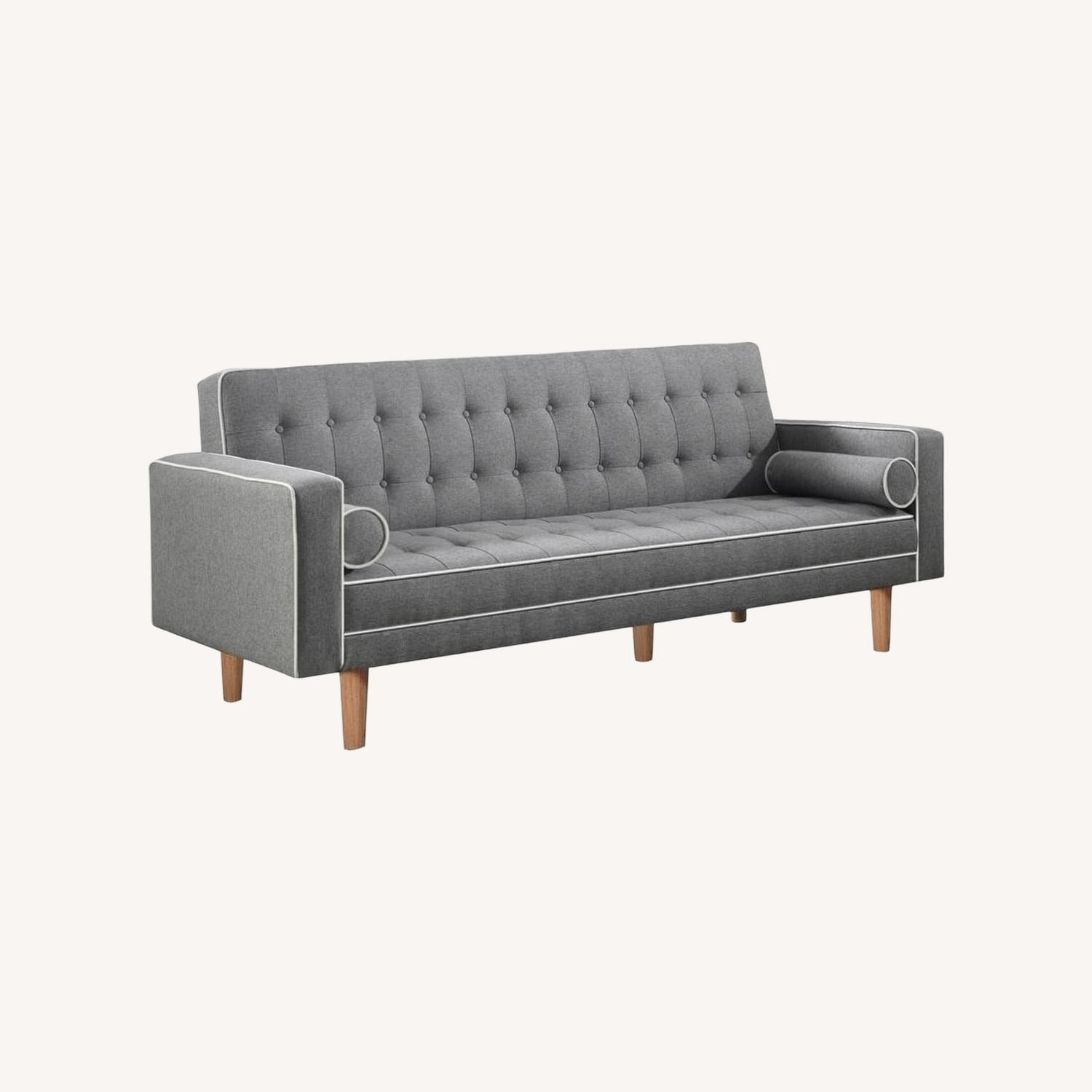 Elevate the comfort and modern charm of your seating area with this Liam sofa bed. The grey linen-like upholstery with white piped edging and button-tufted detailing offers a sophisticated look, while the track arms and natural finish on the sleek wooden legs deliver added visual appeal. With two bolster pillows for extra comfort and support, this sofa bed converts easily to accommodate overnight guests. Designed to seat up to three guests, the semi-firm cushion on this sofa bed features sinuous spring decking with foam fill to inspire comfortable seating.