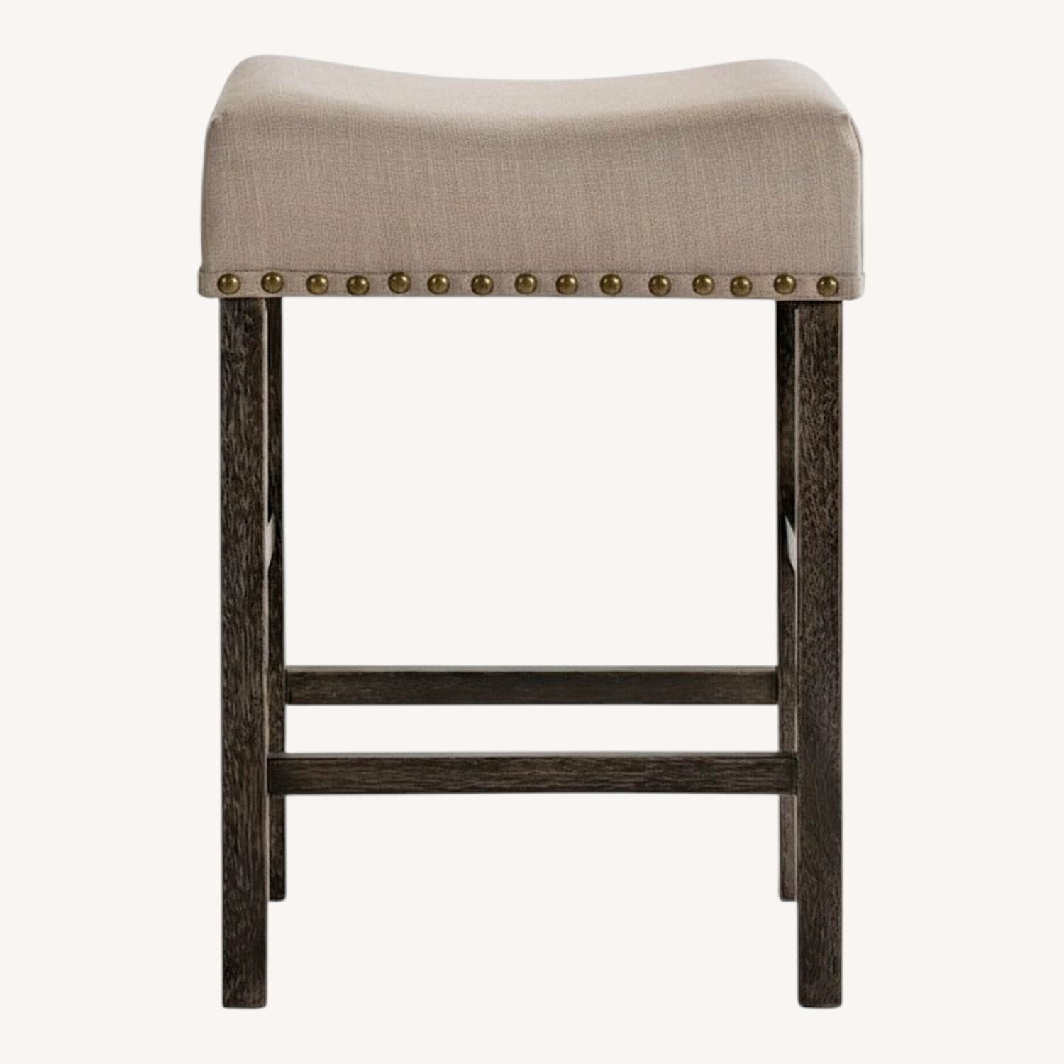 Seller's Notes:About This Product This set of two counter stools measures 26" high, so they sit at just the right height for your breakfast counter or home bar. Crafted from solid, engineered wood, it's upholstered in 100% linen over foam for a cushioned seat. A contoured saddle seat rests on straight legs in a purposefully weathered neutral finish for a well-loved look. These stools also have wooden footrests that hold up in busy homes. Plus, we love that the metallic nailhead trim adds a classic look to complete its traditional appeal. Features Backless: The backless design allows easy access and versatility, making it perfect for any counter space. Armless Stool: Sleek armless design allows unrestricted movement and versatile seating convenience daily. Padded Seat: Provides a padded seat that enhances comfort and offers long-lasting support. Nailhead Trim: Accentuates the stool with elegant nailhead trim for a refined, classic touch. Wood Apron Seat: Crafted with a wood apron seat for durability and timeless aesthetic appeal. Wood Square Leg: Features sturdy wood square legs, providing strong support and modern visual appeal. Made of rubberwood, veneer, and MDF construction Linen Upholstered: Features soft linen fabric offering a breathable, comfortable, and stylish seating experience. Wood is finished in a driftwood color | Upholstery is a natural color in linen blend fabric Has bronzed colored nail heads Seat Height 26 | Seat Depth 16 Wood is made to have the appearance of wood grains Has matching stools and counter height table (Sold Separately)