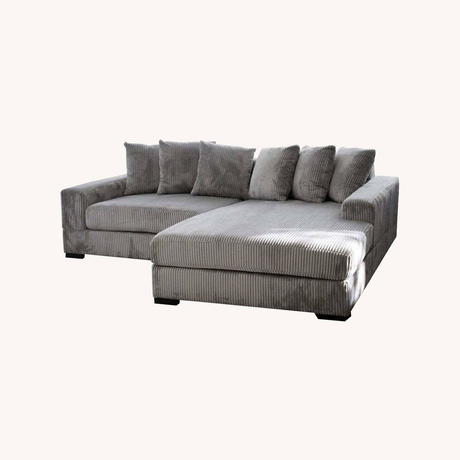 Unparalleled comfort. This deep, upholstered sofa-and-chaise sectional strikes an L-shaped silhouette and seats up to five people for a cozy movie night. It has a durable solid wood frame and corner block feet finished in black. Wrapped in corduroy in a hue of your choice, this piece is padded with foam over sinuous springs for exceptional support. Six toss pillows are also included, layering on the texture and showing off a bold backdrop for your living room.