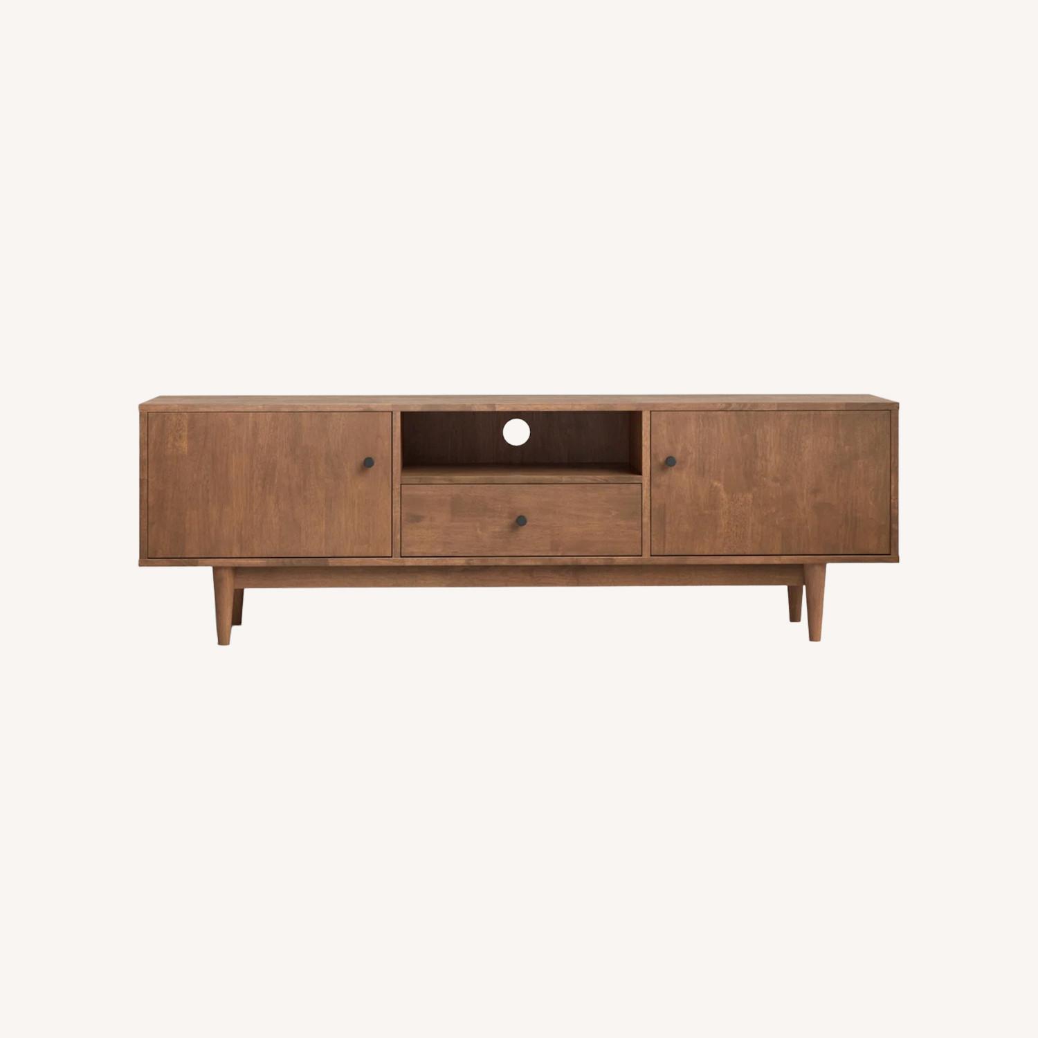 More than just a spot to rest your TV, this entertainment center pairs an eye-catching mid-century design with handy storage. Crafted from a blend of solid and engineered wood, it features a streamlined design with tapered feet and a wood-grain finish for a retro vibe. An open shelf with wire-management cutouts provides the perfect spot for media consoles, while two cabinets and a drawer add a little extra space to stash clutter. This TV stand measures 72" wide and accommodates flat-screens up to 78". A wall anchor is also included for extra stability.