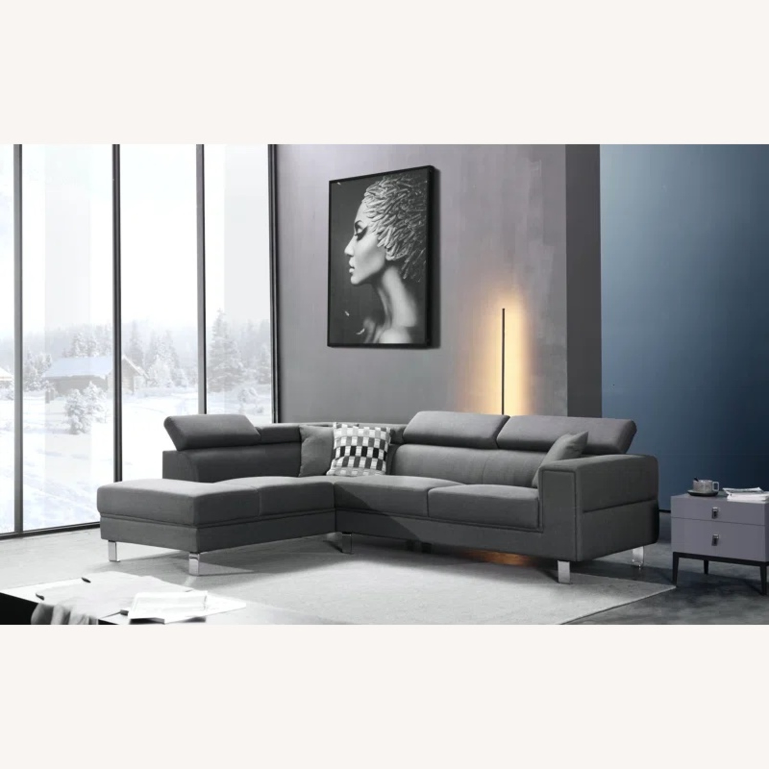 Sophisticated and definitely stylish. This corner sectional design practically encourages you to kick back and take a little snooze. This piece features a comfortable look and feels with adjustable headrests. The traditional square armrest with special lines is a modest luxury.