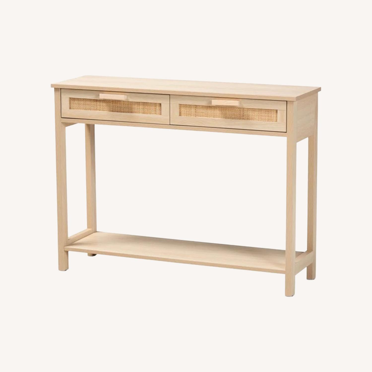 Dressed in the timeless aesthetic of the mid-century, the Sebille console table is an attractive yet versatile household accessory. Made in China, this handy piece is comprised of a sturdy wood frame adorned with natural rattan accents. Two drawers offer convenient storage space while the wide, rectangular shelf acts as a display for larger items. Requiring assembly, the Sebille features a crisp silhouette with clean angles complemented by square legs and rectangular handles. Carrying the appeal of classic design to the modern era, the Sebille console table fits right at home in any interior layout. Due to the nature of the natural materials used in this product, it may have variations in areas such as, but not limited to, color, pattern, grain, and texture. The hair-like strands of rattan/rattan fiber are common due to the nature of the material.