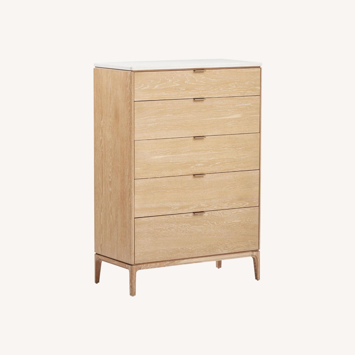 Seller's Notes:Top: Solid marble. Washed Oak: Solid and engineered wood frame and legs, oak veneer over engineered wood drawer fronts. Made with FSC®-certified wood from responsibly managed forests. Metal hardware in a Champagne Bronze finish. 5 drawers open on metal glides. Made in a Fair Trade Certified™ facility, directly benefiting the workers who make it. Made in Vietnam.