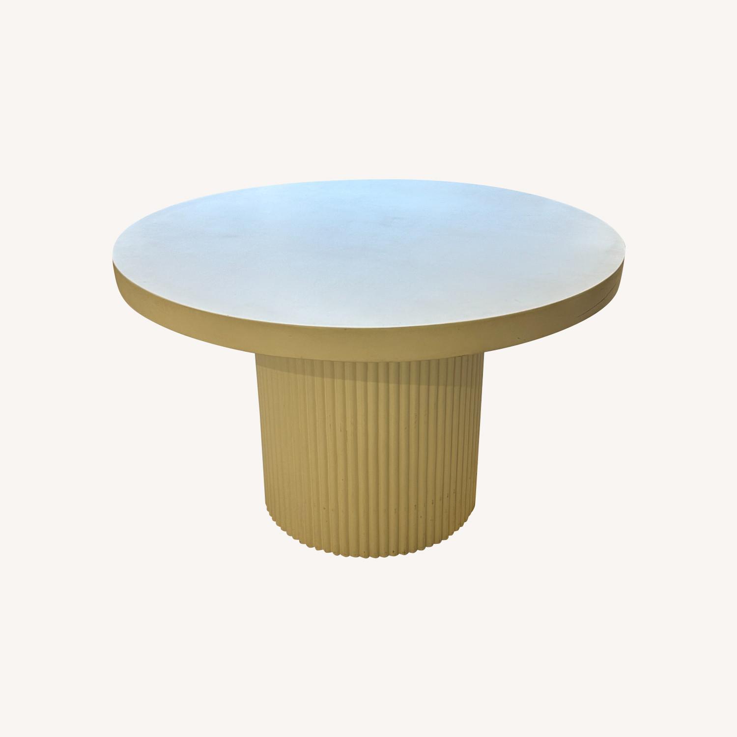 Seller's Notes:Solid concrete table in white with a fluted base. This table has been used for 5-6 years in a retail setting and does have several small chips along the edge of the top, and one small area with some significant damage to the finish, shown in the photos. The tabletop itself is in great condition (it's only the edges/sides that have chips). Can be used indoors or outdoors.