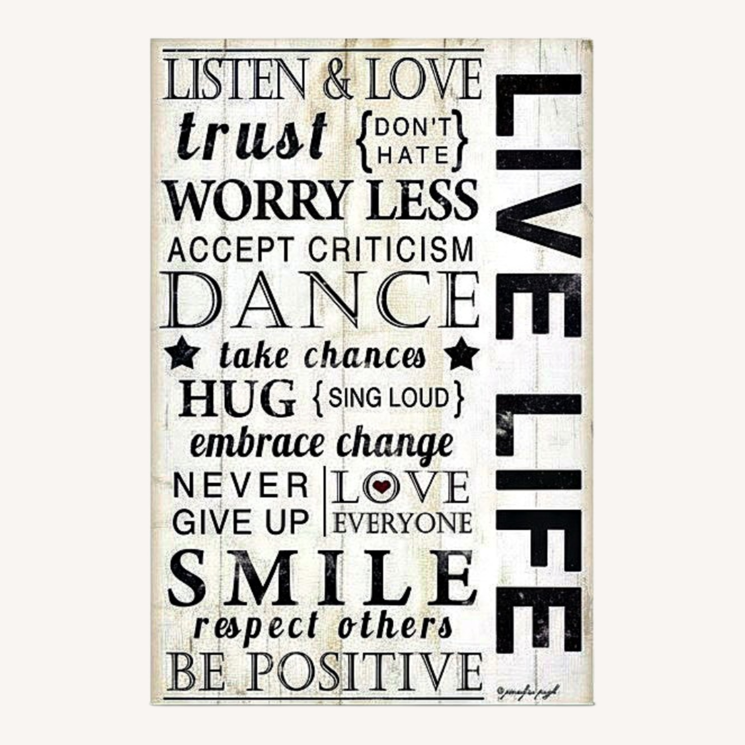 Poster Print entitled 'Live Life'. Off white background with rustic black typography about family sentiments. Multiple sizes available. Primary colors within this image include: White, Dark Gray, Light Gray. Made in USA. Satisfaction guaranteed. Archival-quality UV-resistant inks. Printed on high quality gloss finish paper with archival quality inks. Looks great in dorm rooms, kid rooms, offices, and more.