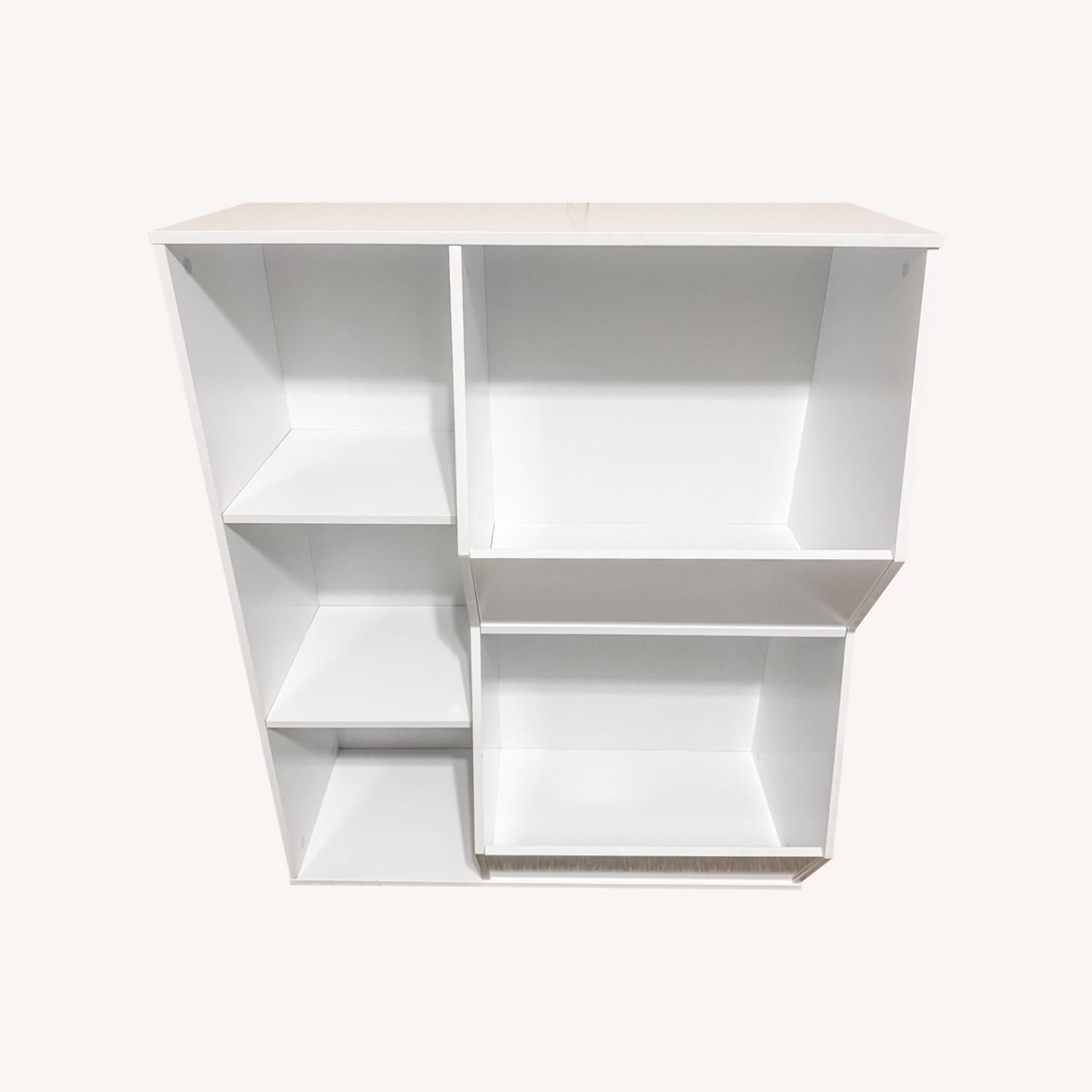 Seller's Notes:This white kid’s bookcase and toy bin is a great addition to any kid’s room! The only blemish is a small crack (as seen in the picture) where the wall mount hardware is installed.