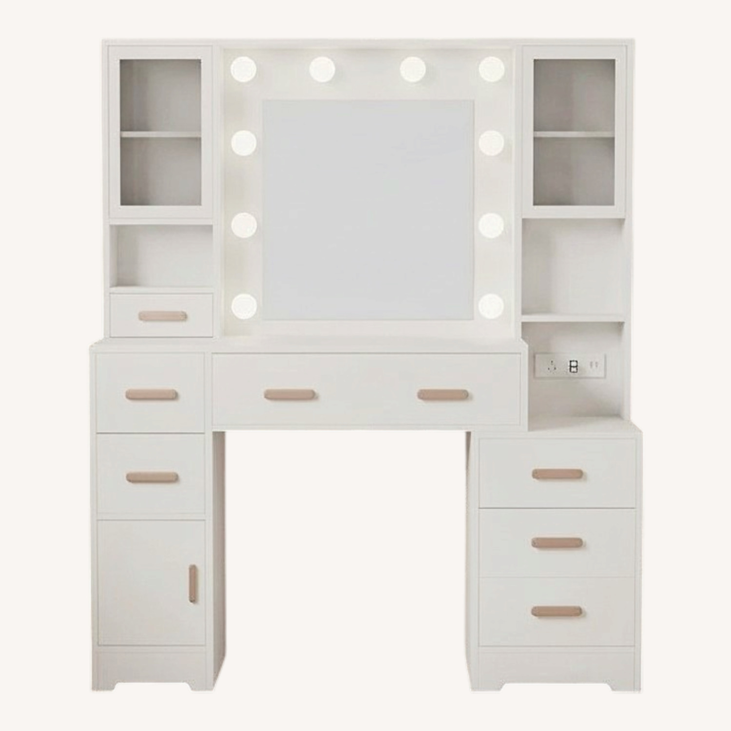 Seller's Notes:This a beautiful white vanity with multiple storage, plug in station with 3 different color light
