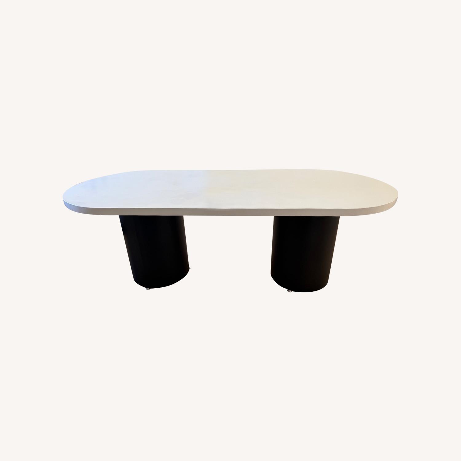 Seller's Notes:Modern oval wood dining table featuring a sleek black metal double-base design. Measures 86.6”L × 35.4”W. The tabletop shows some minor blemishes that can easily be buffed or refinished if desired, though it’s been used as-is with no issues. Solid build and great quality overall.