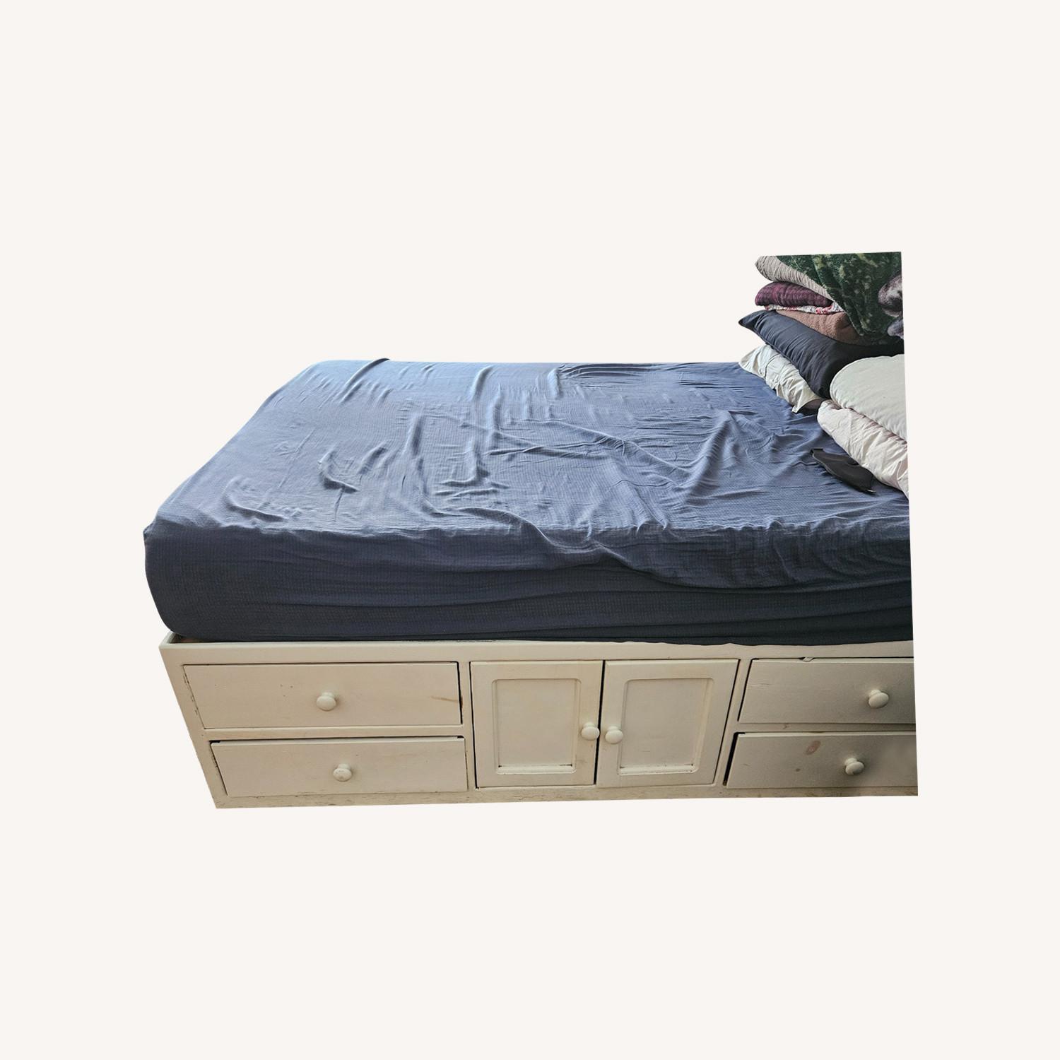 Seller's Notes:Bed frame with built-in storage. White painted wood. Some minor wear. Includes drawers and cabinets. Good for extra storage. It's a bit oddly sized. When I purchased it as advertised as a queen sized bed, but it's slightly smaller than my mattress. I just keep the sides slightly apart and use the gap in between for additional storage. It's completely comfortable and the storage drawers and cabinets are so useful. My sense is that it would work well with a large full as well. Here's the original link: https://www.aptdeco.com/product/handcrafted-queen-size-bed-w-storage