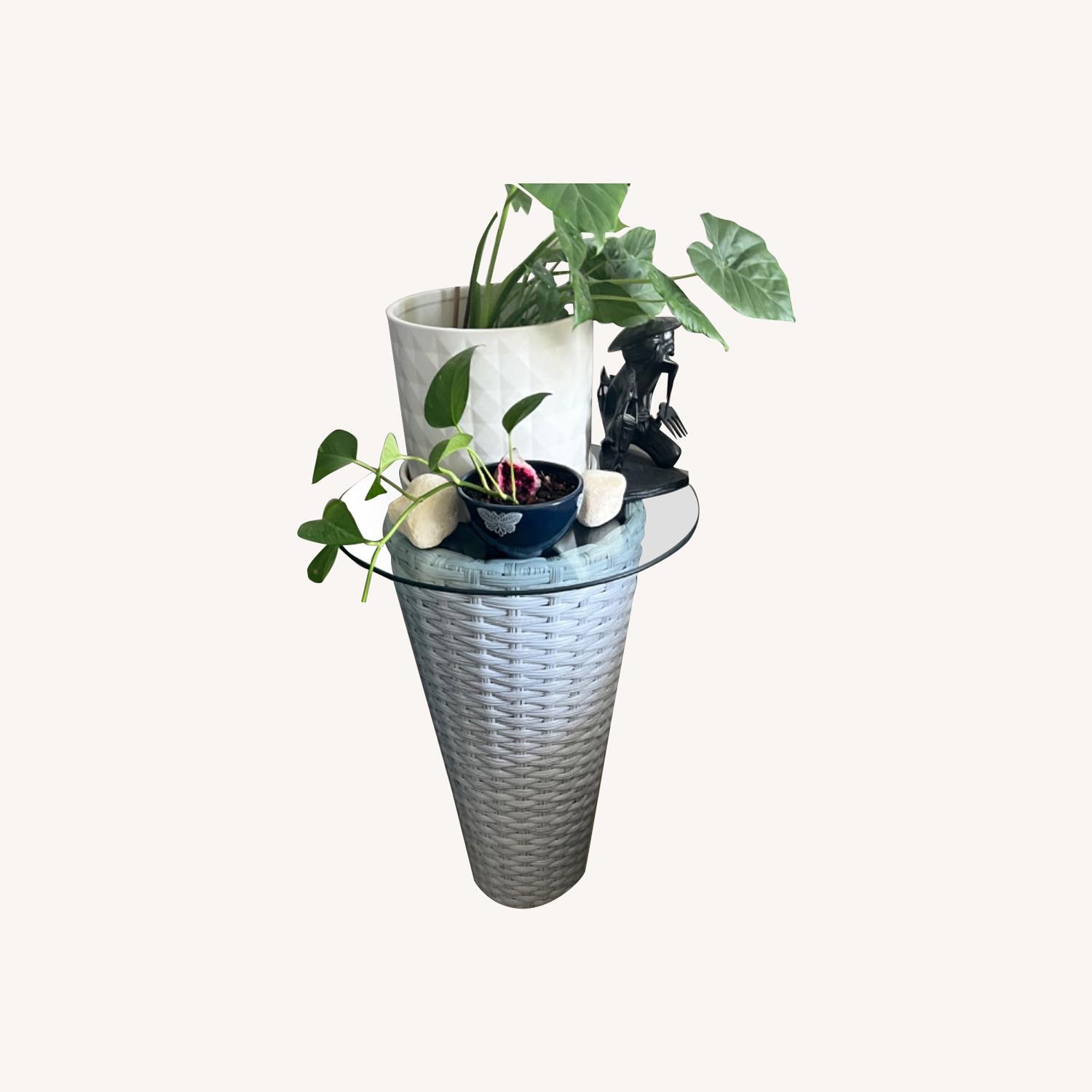 Seller's Notes:Two wicker light, gray, outdoor planters In Great condition