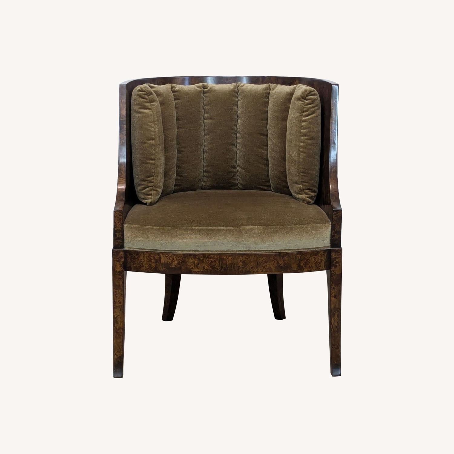 Seller's Notes:This lounge chair by William Switzer features a Burlwood veneer frame with a loose channel tufted back cushion upholstered in velvet.