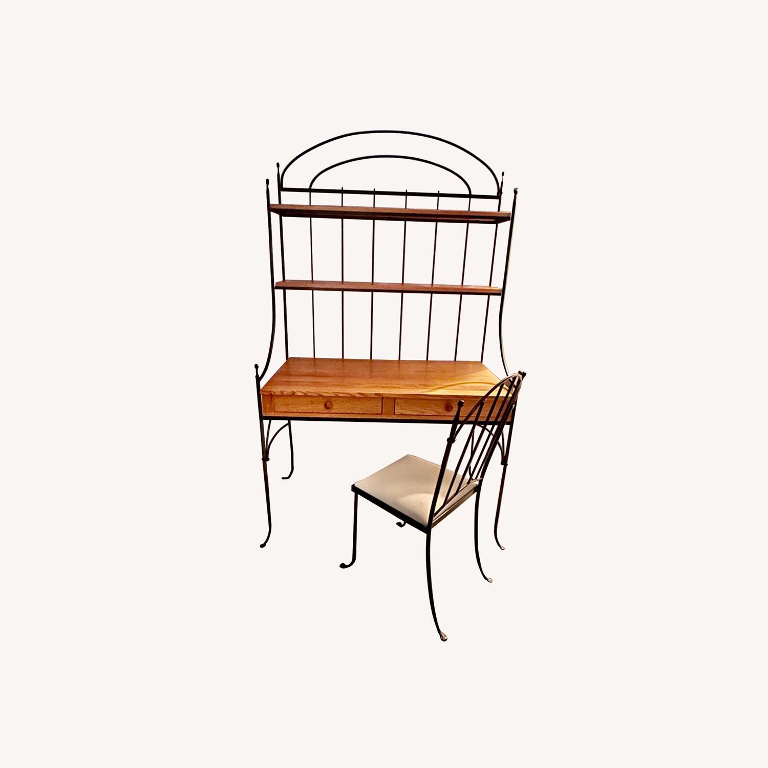 Seller's Notes:This wood and wrought iron desk with matching chair. Bakers rack style. Two shelves and two drawers. Manufactured by Charleston Forge in Boone, NC. Very Good condition. Minor blemishes as shown in photographs. Chair has minor staining.