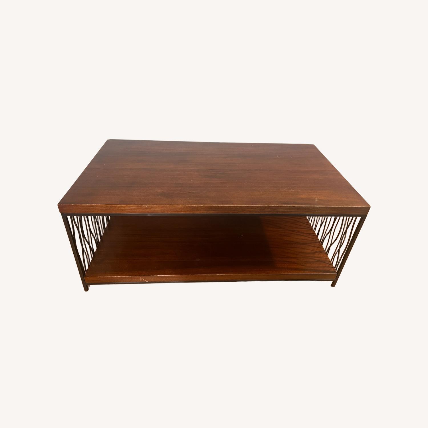 Seller's Notes:Extremely sturdy wooden coffee table with black metal decorative patterned sides - looks a bit like twigs or thin aspen tree trunks. Has served us well, but we're downsizing.