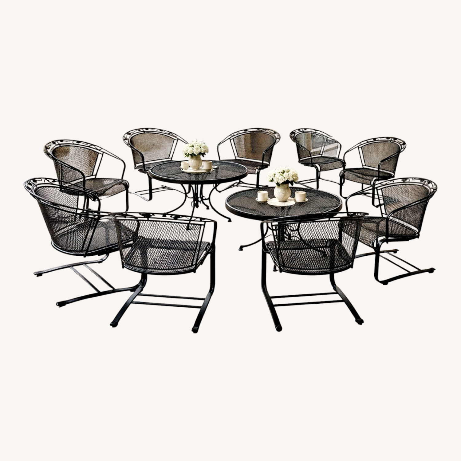 Seller's Notes:A complete set of eight Russell Woodard wrought iron casual chairs from the sought-after Ivy Leaf line. Each chair features the signature hand-applied leaf medallions and scrolling crest rail, paired with a sculpted mesh seat and back. The frames sit on Woodard’s classic barrel rocker base—subtle motion, balanced stance, and far more comfortable than fixed wrought iron forms. The design falls squarely within Woodard’s mid-century production, where traditional garden ornament meets clean, engineered lines. The ivy motif adds depth without crowding the silhouette; from a distance the chairs read crisp and architectural, while the detailing comes forward up close. All eight chairs match. The set presents cleanly with a fresh, even finish and sharp definition in the leaf appliqués and scrollwork. Mesh is tight, frames are true, and the rocking action is consistent across the group. Protective floor glides have been installed on each chair, allowing for smooth movement while safeguarding interior surfaces—ready for immediate use indoors or out. *Tables not included Dimensions Weight, Each Chair: 35 Lbs Seat Height: 31 inches Seat Width: 18.5 inches Seat Depth: 17 inches Arm Width: 26.5 Inches Ground to Seat lip: 16 inches Depth: 26.5 inches