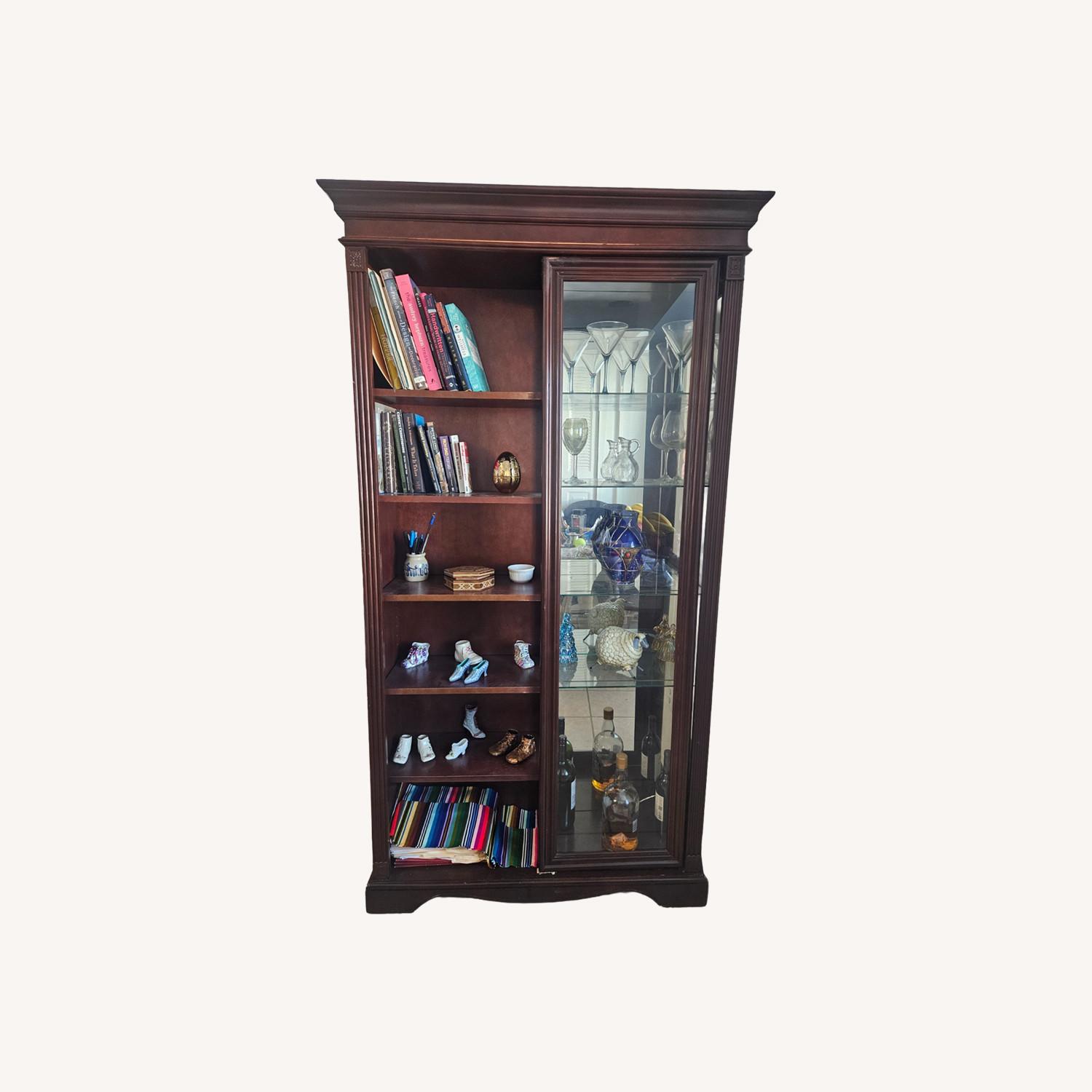 Seller's Notes:This display cabinet is a stylish addition to any living room, featuring a rectangular shape with glass doors for easy viewing of contents. Made from a combination of wood and glass, with a rich brown color finish, this cabinet provides ample storage space with its six shelves. The handle material is also glass, adding a modern touch to the design with lights. This free-standing cabinet stands at 80 inches tall and 42 inches long, making it a versatile and functional piece of furniture for showcasing and organizing items in your home. Has a small broken glass at the bottom right.