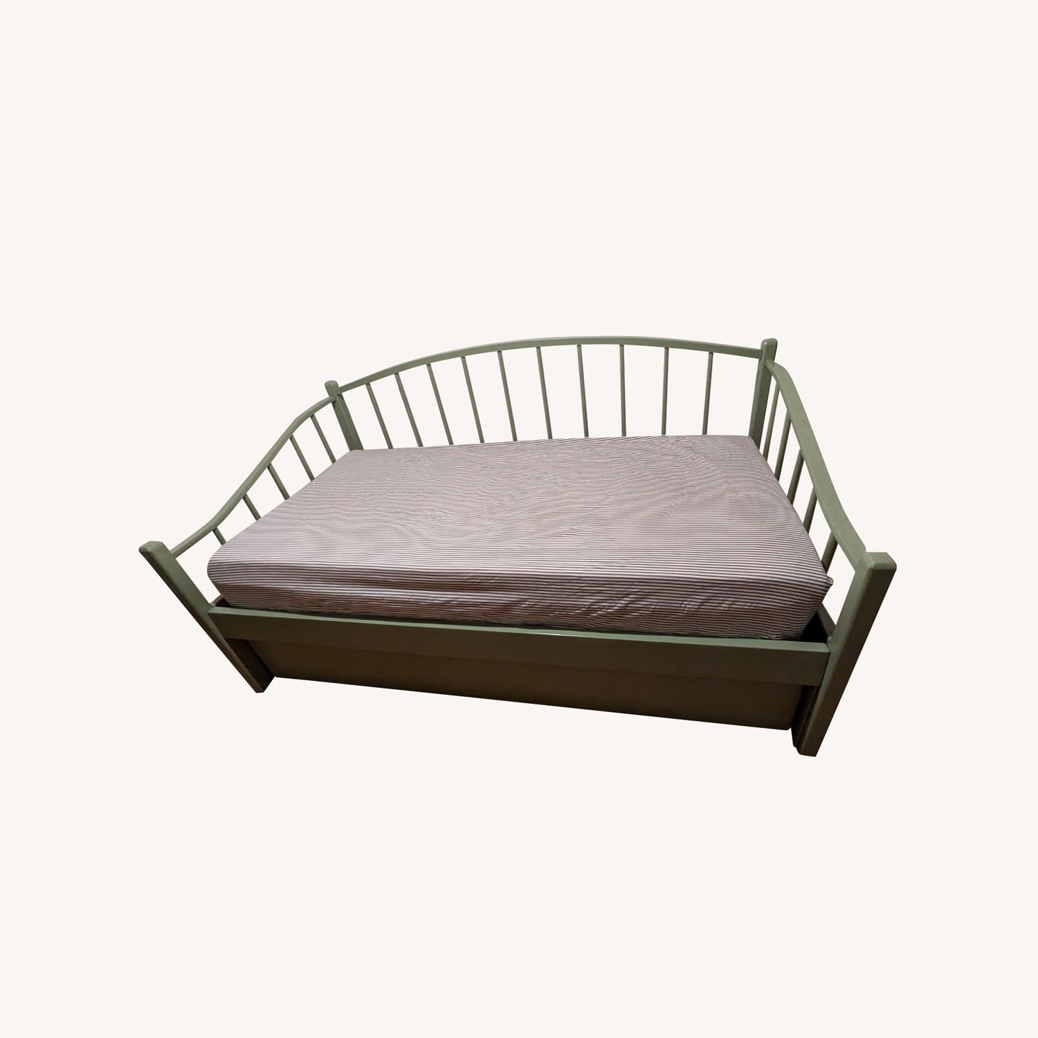 Seller's Notes:Twin Daybed with Trundle Moving Sale! We're selling this barely used daybed kept in the guest room. It fits two standard-size twin mattresses (add-on for $150). Modern classic cottage styling without sacrificing an ounce of charm. The linear daybed is crafted with wood and dressed in a french green-colored finish. Daybed/ trundle accommodates two twin mattresses. Dimensions: 80" W x 37" H x 44" D Minor nicks on the edges of the wood.