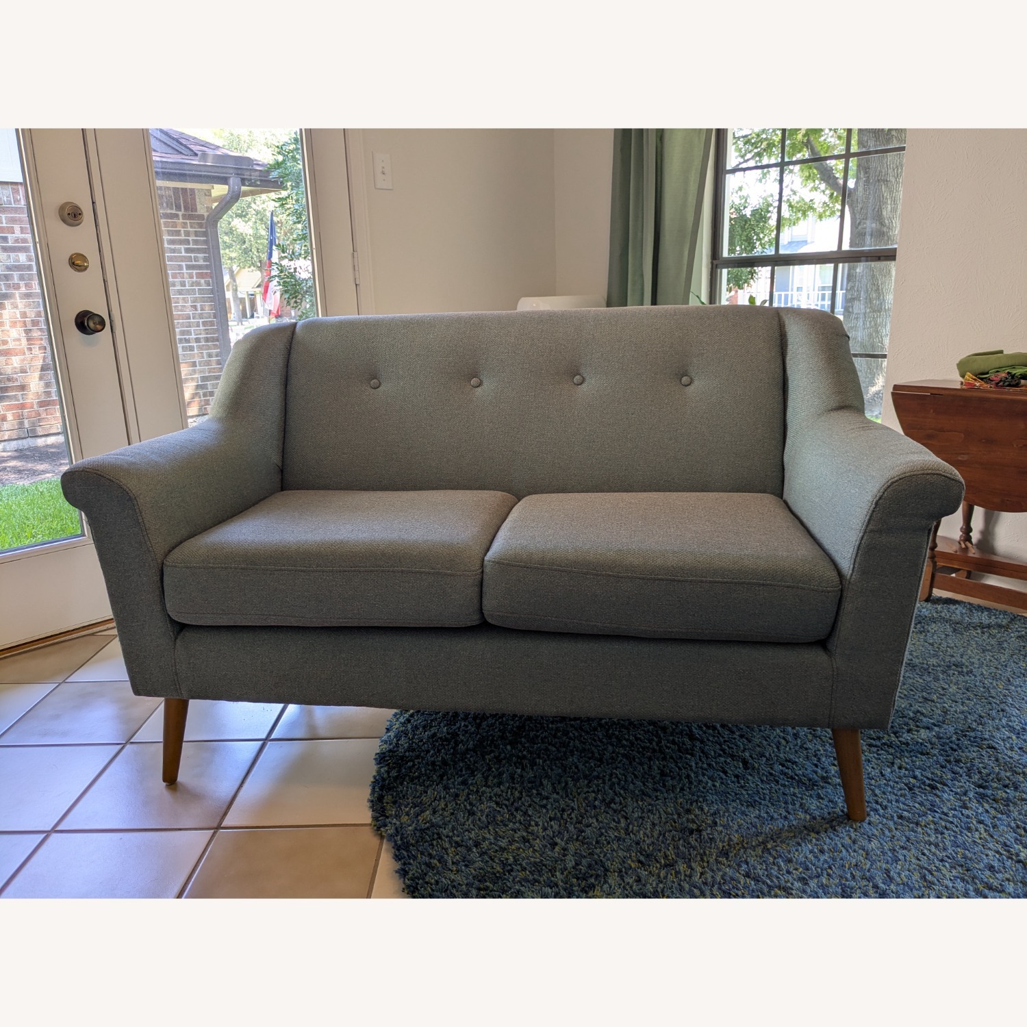 Settle into the comfort of this mid-century-inspired Shay loveseat featuring a sloped, wingback-style frame, splayed wooden legs and chic button tufting. Smooth, neutral cement-gray fabric upholstery makes this two-seater a luxe addition to your living area.