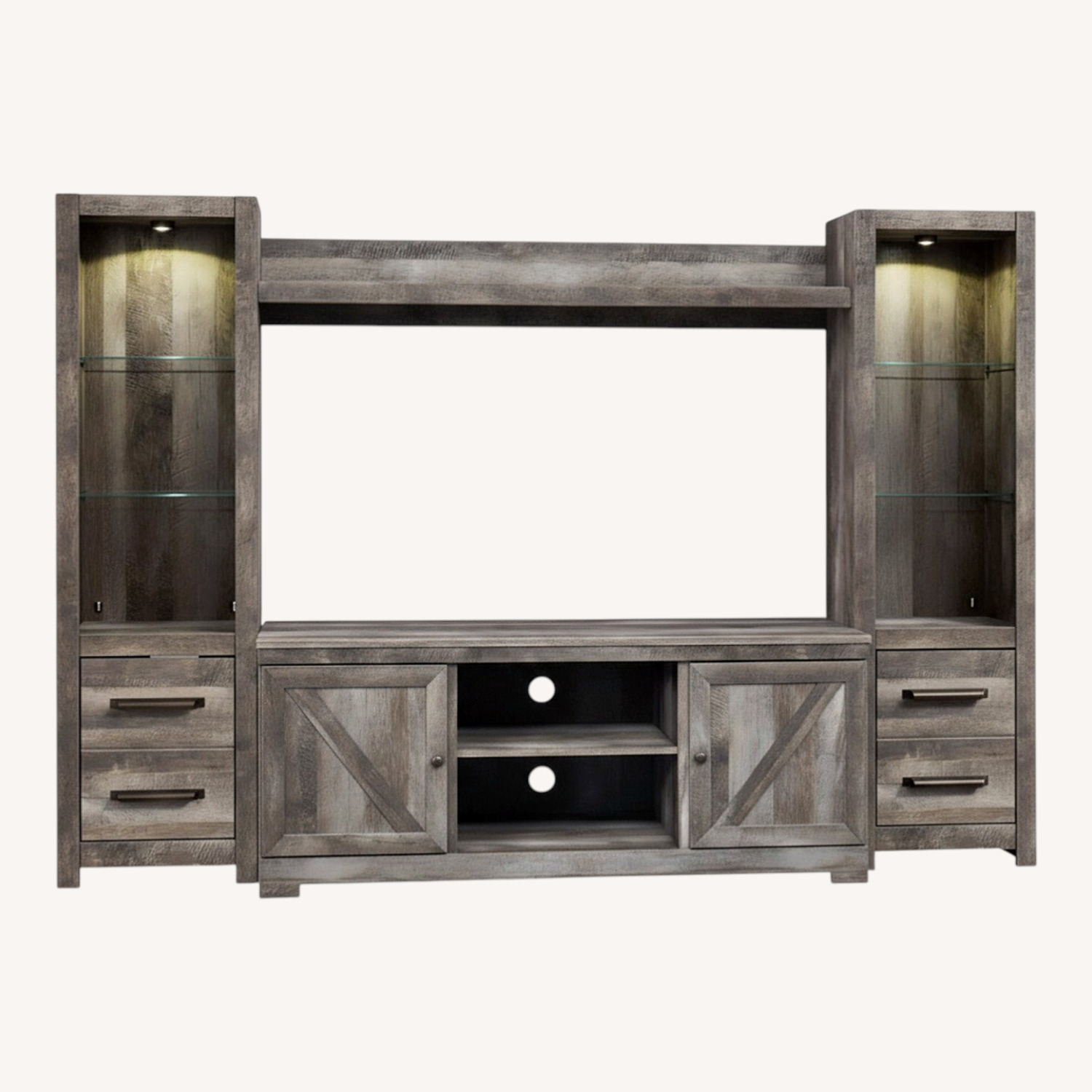 Seller's Notes:The Wynnlow entertainment center is sure to win your heart with its daring designer take on modern rustic. Its crisp, clean and minimalist-chic profile is enriched with a striking replicated oak grain with thick plank styling and a weathered gray finish for that much more authentic character. Crossbuck detailing adds a brilliant barn door inspired touch, while LED overhead lighting and glass shelving invite you to artfully put home accents on display.