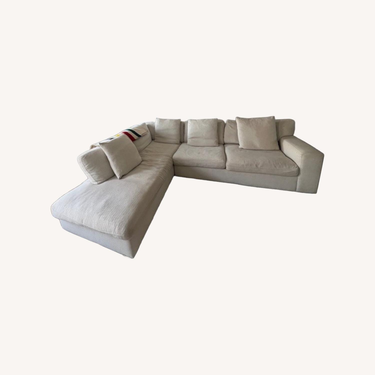 Seller's Notes:- This couch is a dream! Super cozy, "shelter-like" feel seats 5 to 6 people comfortably. There is a subtle stain on the left-side arm, but it was cleaned up well so you barely notice (see pictures) . Now it just looks like a soft shadow is being cast on the couch. - Fabric is easy to clean. Pillow and cushion cases are removable for machine washing. - Fully Assembled Size : Full back ( 113" W, 30" H) - Size by Piece: Chaise Piece (42" W, 91" D), Sofa Piece (71" W, 37.5" D, seat cushion depth 30") - Low profile foot pegs are detachable for ease of moving.